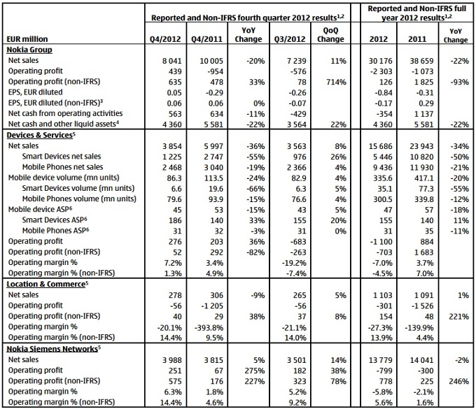 Компания Nokia подвела итоги четвертого квартала и 2012 финансового года. Последние три месяца для компании оказались успешными и ей удалось получить 439 миллионов евро прибыли, тогда как выручка составила 8,04 миллиарда евро. Однако, большая часть прибыли была получена за счет роста доходов от подразделения Nokia Siemens Network, хотя подразделение Devices & Services также оказалось в плюсе, но не столь значительном. Хотя сам факт положительного итога предновогоднего квартала для компании позитивен. Для сравнения в предыдущем потери в этом секторе составили около полумиллиарда евро. Это и привело к тому, что год для компании закончился со впечатляющим убытком 2,3 миллиарда евро. В 2011 году итоговые убытки составили чуть более 1 миллиарда.