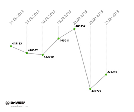 За сентябрь 2013 года Dr.Web для Android зафиксировал более 11 миллионов случаев срабатывания антивирусного монитора при выявлении вредоносного или сомнительного ПО и более 4 миллионов случаев обнаружения вредоносных программ при сканировании мобильных устройств по требованию пользователей. Анализ собранной с использованием Антивируса Dr.Web для Android статистики показал: в сентябре 2013 года пользователи запускали сканирование около 17 000 000 раз, при этом наличие вредоносного или сомнительного ПО было зафиксировано более 4 000 000 раз. А поскольку в случае выявления на мобильном устройстве сразу нескольких угроз они отображаются в программном продукте списком в одном окне, реальное количество обнаруженных вредоносных программ несколько выше указанной цифры, считают эксперты компании.