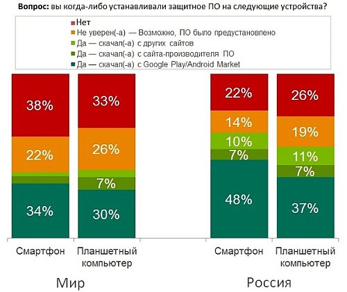 Российские пользователи стали одними из самых ответственных в мире и в большинстве своем установили специализированное защитное ПО на свои мобильные устройства. Таков один из итогов опроса, проведенного компанией B2B International совместно с "Лабораторией Касперского" летом 2013 года. Согласно полученным данным, так поступили 65% владельцев смартфонов и 55% владельцев планшетов на базе Android. И это значительно больше, чем в целом по миру, отмечают эксперты.