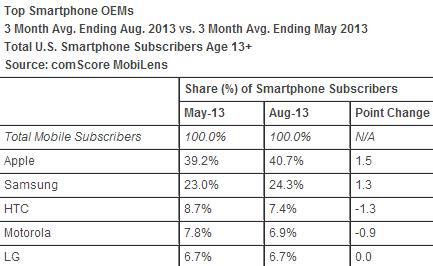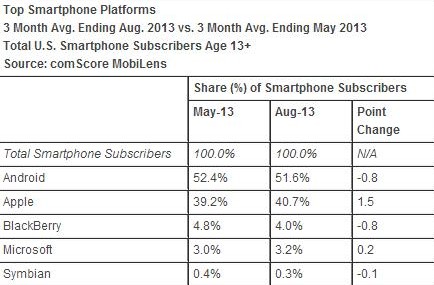 Аналитическая компания comScore представила статистическое исследование рынка смартфонов США по данным за квартал с окончанием в августе 2013 года. По полученным сведениям, доминирующей ОС на рынке остается Android, однако его присутствие несколько сократилось. В сравнении с кварталом, завершившимся в мае сокращение составило 0,8 процентного пункта. В то же время, находящаяся на втором месте в рейтинге популярности iOS выросла на 1,5 процентных пункта. В итоге доля первой составляет 51,6%, а второй — 40,7%. На долю все прочих ОС приходится менее 10% рынка. При этом BlackBerry несмотря на продолжающуюся тенденцию снижения популярности сохраняет третье место, занимая 4% рынка и потеряв за квартал 0,8%. ОС Windows Phone от Microsoft выросла на 0,2 п.п., но ее доля составляет всего 3,2%. Медленное исчезновение Symbian продолжается — ее доля снизилась с 0,4% до 0,3%.