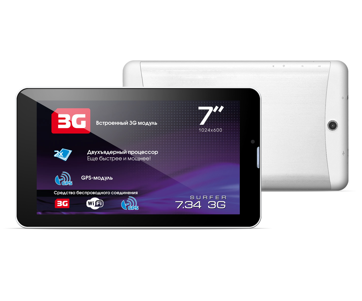 Explay Surfer 7.34 3G имеет 2 слота для сим-карт, а также оснащен двумя видеокамерами основной 2 МП и фронтальной для видеосвязи с VGA разрешением, встроенным модулем GPS, Wi-Fi - модулем (поддерживаются стандарты 802.11 (b/g/n), и встроенной А-GPS системой. Вес планшета составляет всего 290 грамм. В комплекте идет фирменный чехол от Explay. Рекомендуемая стоимость модели Explay Surfer 7.34 3G - 4990 рублей.