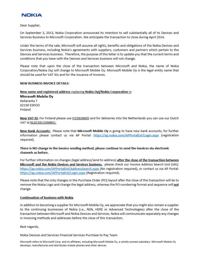 В рамках продажи мобильного подразделения компании Nokia Microsoft стали известна интересная информация по Nokia Oyj. В письме направленном из штаб-квартиры Nokia поставщикам комплектующих сообщается, что проект Nokia Oyj будет преименован в Microsoft Mobile Oy. Компания будет существовать, но уже как полностью принадлежащая Microsoft, действующие проекты будут поддерживаться новым владельцем, также как и выпуск мобильных устройств.