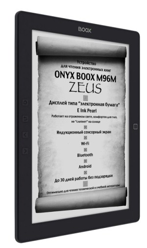 В России поступила в продажу электронная книга ONYX BOOX M96M Zeus. По сравнению с предыдущими моделями серии ONYX BOOX она получила более совершенные технические характеристики. Новая модель работает на базе ОС Android 4.0.4, а также имеет встроенный Bluetooth-модуль, позволяющий подключать дополнительные периферийные устройства и аксессуары. Ридер ONYX BOOX M96M Zeus оснащен 9,7-дюймовым сенсорным индукционным дисплеем E Ink Pearl с контрастностью 12:1, разрешением 825х1200 точек и антибликовым покрытием, обеспечивающим максимальный комфорт для глаз, как при чтении обычной бумажной книги. Экран защищен обрамляющей металлической рамкой и стальной пластиной, расположенной за ним, дополнительную защиту обеспечивает качественный чехол, который поставляется в комплекте с устройством.