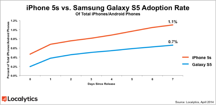 Глобальный запуск смартфона Samsung Galaxy S5 состоялся 11 апреля, и первая неделя оказалась для модели вполне успешной. По данным Localytics на него пришлось 0,7% всех активированных Android-смартфонов. Для сравнения, за первую неделю продаж iPhone 5S их доля достигла 1,1% всех iOS устройств. При этом нельзя не отметить, что общий объем рынка Android-смартфонов намного больше, чем устройств от Apple, и производятся они множеством независимых компаний. Поэтому разница в процентных долях может быть обусловлена особенностями рынка.