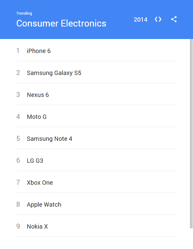 Компания Google объявила результаты 2014 года по самым популярным поисковым запросам в мире на разную тематику. В том числе и по потребительской электронике. В прошлом году чарт возглавил смартфон iPhone 5s, а в этом году его преемник — iPhone 6. Второй по популярности запросов гаджет — это Samsung Galaxy S5. Третий — Google Nexus 6. Замкнули пятерку самых популярных устройств пользовательской электроники еще два смартфона: Motorola Moto G и Samsung Glaxy Note 4.