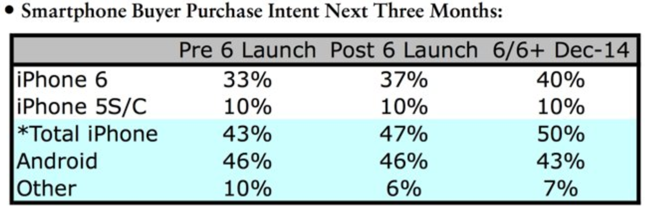 Рост числа людей, которые намереваются приобрести iPhone 6 идет в разрез с ситуацией прошлого года, когда о планах по покупке iPhonу 5s накануне Нового года говорили 44% опрошенных, против 50% на момент начала продаж. Всего же о планах по покупке нового iPhone положительно ответили 50% из 1004 опрошенных представителями Piper Jaffray. 43% респондентов сообщили, что в течение следующего квартала они намерены приобрести один из аппаратов на Android.