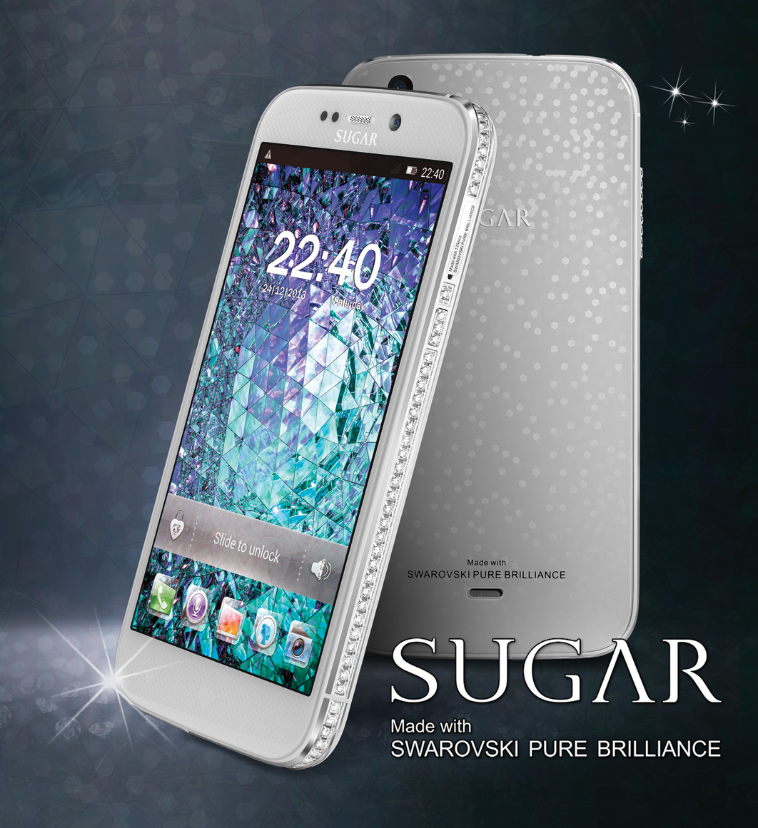 На российский рынок вышел бренд Sugar с «ювелирным» смартфоном для девушек. Модель обладает одноименным с названием бренда именем и инкрустирована 129 кристаллами SWAROVSKI общим весом 5.16 карат. Кнопки управления под сенсорным экраном также представлены в виде кристаллов. Сам корпус выполнен с переливами из белого пластика, защищенным стеклом Gorilla Glass второго поколения.