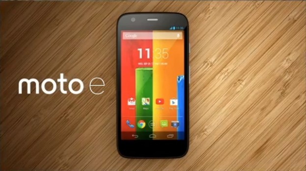 Работает Motorola Moto E под управлением ОС Android 4.4.2 KitKat. Также можно отметить наличие поддержки 3G, Wi-Fi 802.11n, Bluetooth, GPS и FM-радио. В наличии также и варант с поддержкой двух SIM карт. Смартфон оснащен 5-МП камерой и аккумулятором на 1980 мАч. Стандартная модификация имеет размеры 124.8 x 64.8 x 12.3 мм при весе в 140 грамм. Аппарат вышел одновременно на рынки Индии, Британии, Бразилии, Мексики, Испании и Канады. Его стоимость составляет €110, кроме Индии, где через он-лайн магазин Flipkart он продается по 6999 рупий, что эквивалентно 117 долларам США.