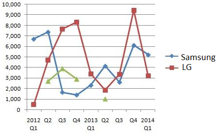 Несмотря на продолжающиеся судебные баталии и многочисленные заявления представителей Apple о необходимости сокращения зависимости компании от поставок со стороны Samsung, ситуация с обеспечением производства iOS устройств корейской компанией остается без изменений. Например, именно Samsung поставила 5,2 миллиона панелей для планшетов iPad в первом квартале текущего года, что составляет 62% всех 9,7-дюймовых экранов закупленных Apple. Кварталом ранее на долю Samsung пришелся 61% таких панелей.