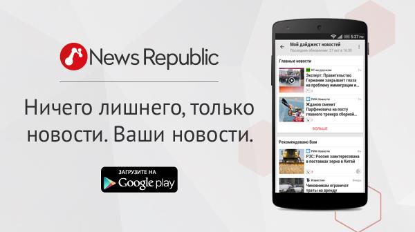 Приложение News Republic существует уже четыре года и получило распространение в более чем десяти странах мира, включая США, Великобританию, Францию, Германию, Италию и Испанию. Общее количество пользователей апплета превышает 12 миллионов. Теперь популярное приложение получило поддержку русского языка и более тридцати контент-провайдеров, включая LifeNews, «Известия», РИА «Новости», «Комсомольскую правду», «RT» и другие общеполитические издания. Кроме того, российским пользователям будут доступны новости самых популярных специализированных ресурсов – Appleinsider.ru, Mobileimho.ru, Auto.mail.ru, IXBT.com, Kinopoisk.ru и др.
