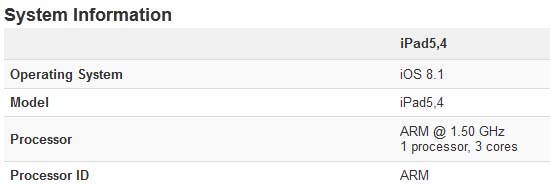 Точные технические характеристики планшета Apple iPad Air 2 официально не назывались. Компания Apple традиционно делает упор не на количество ядер и объем оперативной памяти, а говорит лишь в общих чертах об улучшениях. Поэтому первым источником о некоторых данных устройств становятся сведения получаемые из популярных бенчмарков. Для iPad Air 2 таковым стал Geekbench, на котором появились данные о его процессоре и объеме оперативной памяти.