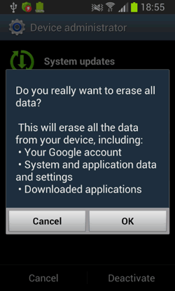 Команда на блокировку целевого устройства может быть отдана злоумышленниками как при помощи JSON-запроса с веб-сервера, так и в виде SMS-сообщения, содержащего директиву set_lock. Как и многие троянцы семейства Android.Locker, Android.Locker.38.origin блокирует устройство, демонстрируя сообщение с требованием выкупа, которое практически невозможно закрыть. Однако, если пострадавший пользователь все же попытается удалить вымогателя, отозвав у вредоносной программы права администратора, Android.Locker.38.origin задействует дополнительный уровень блокировки, отличающий его от прочих подобных Android-угроз. Вначале троянец переводит зараженное устройство в ждущий режим, блокируя экран стандартной системной функцией. После его разблокировки он демонстрирует ложное предупреждение об удалении всей хранящейся в памяти устройства информации.