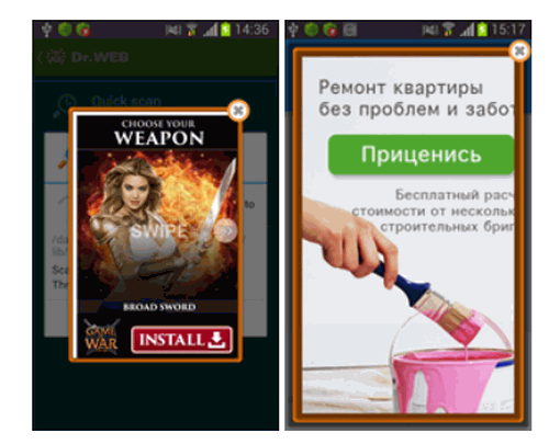 Демонстрируемые Adware.MobiDash.2.origin баннеры могут быть любого размера и в ряде случаев способны перекрывать собой не только окна работающих программ, но и интерфейс операционной системы. На данный момент специалисты компании «Доктор Веб» обнаружили в каталоге Google Play несколько приложений, в которых содержится модуль Adware.MobiDash.2.origin, в общей сложности они были установлены более 2 500 000 раз.
