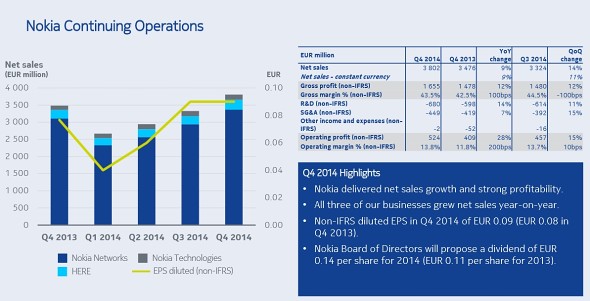 Компания Nokia находится в процессе реструктуризации, которая произошла в силу радикального изменения всей структуры бизнеса, после продажи Devices & Services компании Microsoft. Теперь основными подразделениями Nokia являются Nokia Networks, Nokia Technologies и HERE, а на финансовые результаты влияют суммы выплат со стороны американской корпорации. В результате в 4 квартале 2014 года удалось показать рост прибыли в сравнении с аналогичным периодом предшествующего года. Чистая выручка от продаж составила 3,8 млрд Евро, против 3,476 млрд евро годом ранее, что дает рост выручки в 14%. В основном результат достигнут за счет прогресса в Nokia Networks, нарастившей продажи в Азии и Европе. Операционный доход при этом вырос на 28%.