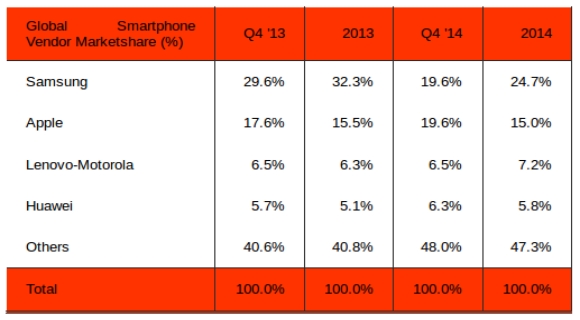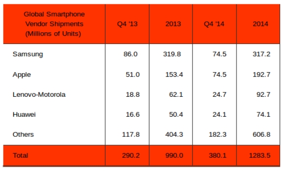 По данным Strategy Analytics компания Apple, благодаря рекордным продажам смартфонов iPhone 6 и iPhone 6 Plus, стала номером один в мире по продажам смартфонов в четвертом квартале. По сведениям SA компании Apple удалось реализовать 74,5 миллиона смартфонов, отодвинув на второе место компанию Samsung, которой впрочем удалось поставить такое же количество смартфонов. При этом стоит отметить, что годом ранее Apple продала за тот же период 51 миллион аппаратов, а Samsung 86 миллионов. При этом в целом за год Samsung удалось реализовать 317,2 млн смартфонов, тогда как Apple только 192,7 миллиона.