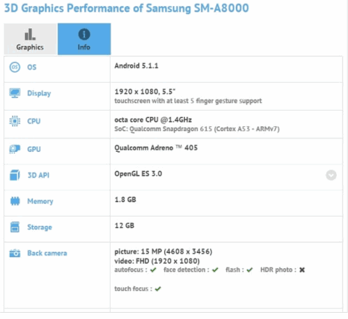 Кроме того, появились результаты тестирования устройства с помощью бенчмарка GFXBench. Там можно найти характеристики смартфона, например, указано, что устройство получит такой же экран, как у предшественника - 5,5-дюймовый с разрешением 1080p, а не 5,7-дюймовый. Также упоминаются процессор Qualcomm Snapdragon 615, 2 ГБ RAM, 16 ГБ встроенной памяти (12 ГБ доступно пользователю), 16-Мп камера и операционная система Android 5.1.1. По всей видимости, Samsung Galaxy A8 будет заключен в компактный металлический корпус, как и другие представители серии.