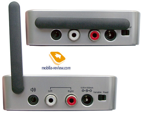 Приемник сигнала выполнен в прямоугольном корпусе из гладкого пластика черного и серебристого цветов. Форма корпуса приемника ориентирована для установки на горизонтальную поверхность. Таким образом, лицевой панелью устройства выступает верхняя поверхность корпуса. Панель несколько скошена для большего удобства в эксплуатации. На ней размещены органы управления и кнопка для инициации сопряжения с передатчиком. Правая и левая боковые стороны оставлены пустыми, на передней панели находится окошко приемника инфракрасного пульта управления, а на задней – два разъема RCA для подключения к аудиосистеме, стереовыход mini-jack, разъем для сетевого адаптера, переключатель диапазона и поворотная антенна.