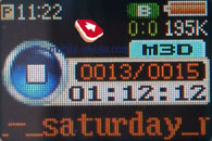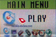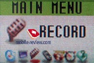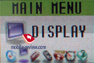 Во время воспроизведения на дисплей одновременно выводится информация о текущем времени, времени воспроизведения, уровне заряда батарей, типе и битрейте файла, количестве файлов в папке, при этом остается достаточно свободного места под другие системные значки. Информация об имени файла или текст из тега ID3 выводятся на дисплей в режиме установки, во время воспроизведения их место занимают две строчки а-ля спектральный анализатор. Последние носят чисто декоративную функцию, полезная нагрузка практически отсутствует, при желании их можно отключить. Меню плеера имеет сквозную горизонтальную организацию и представлено небольшими графическими значками с подписями. При выборе какого-либо пункта его значок отображается в увеличенном виде, все остальные значки продублированы в уменьшенном виде внизу экрана. Подобный подход производит неоднозначную реакцию, однако скорее положительную, нежели негативную. Меню содержит несколько разделов и пунктов: Play, Display, Record, Set, Format, S-Watch и Inform. Play. Здесь содержатся средства для настройки и включения режимов повтора, возобновления воспроизведения с точки остановки, шага измеряемого времени, скорости воспроизведения, а также пятиполосный эквалайзер с возможностью ручной настройки и система улучшения звучания QBS.