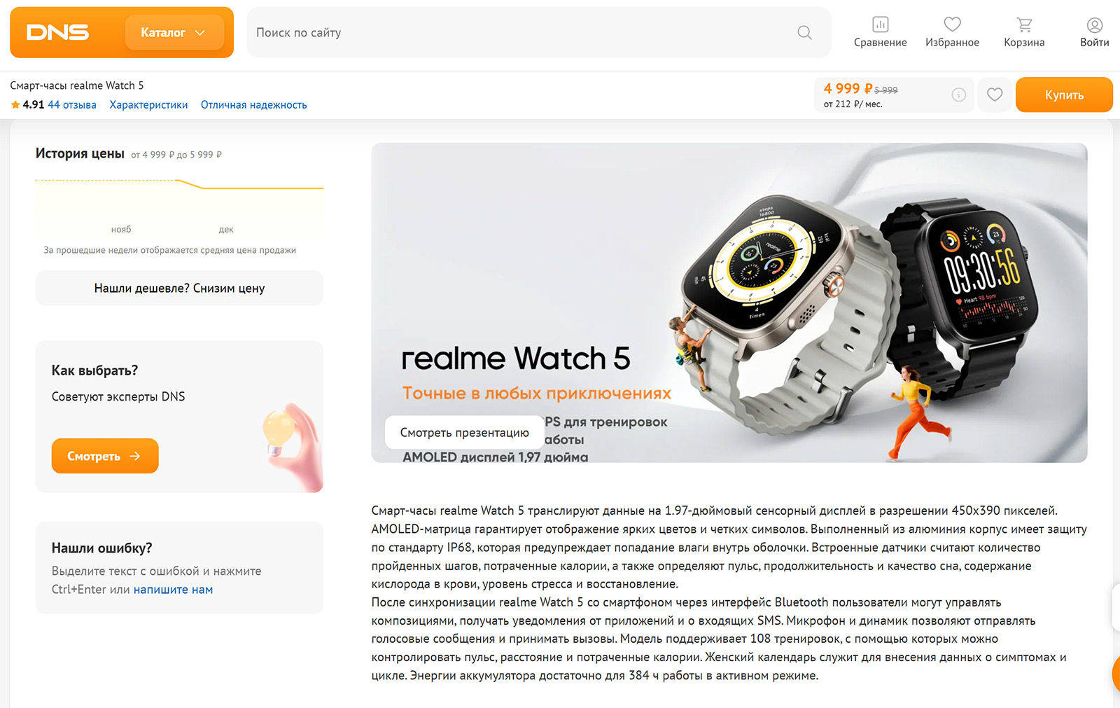 Давайте вернемся к realme Watch 5 и на их примере посмотрим, как выглядят описания в магазинах, которые их продают, проверим на сайте DNS.