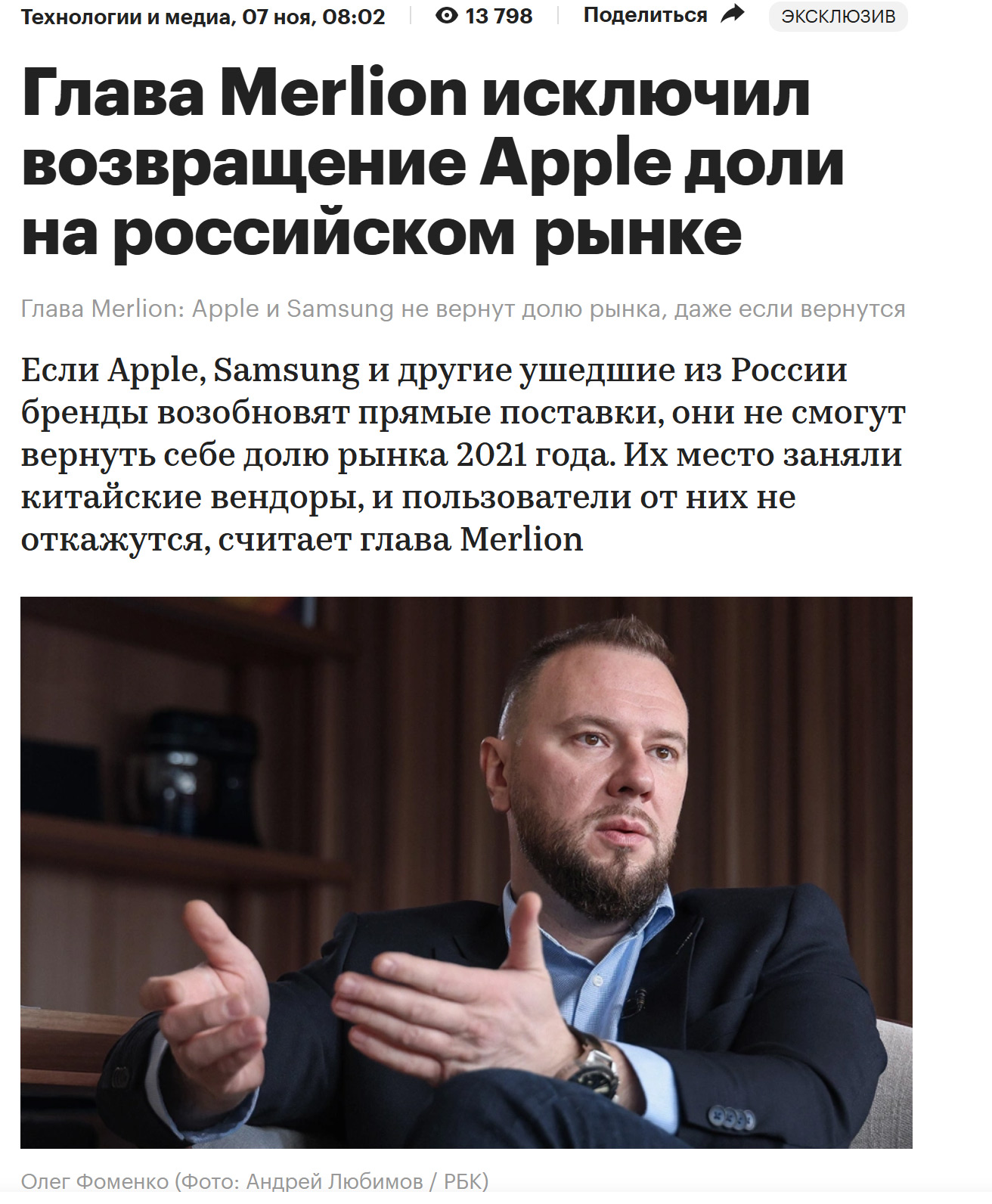 В РБК вышло программное интервью генерального директора дистрибьюторской компании Merlion (ей также принадлежит «Ситилинк») Олега Фоменко. Перечислять все сказанное в интервью не буду, просто выделю несколько мыслей, это не подстрочник, а именно смысл сказанного: