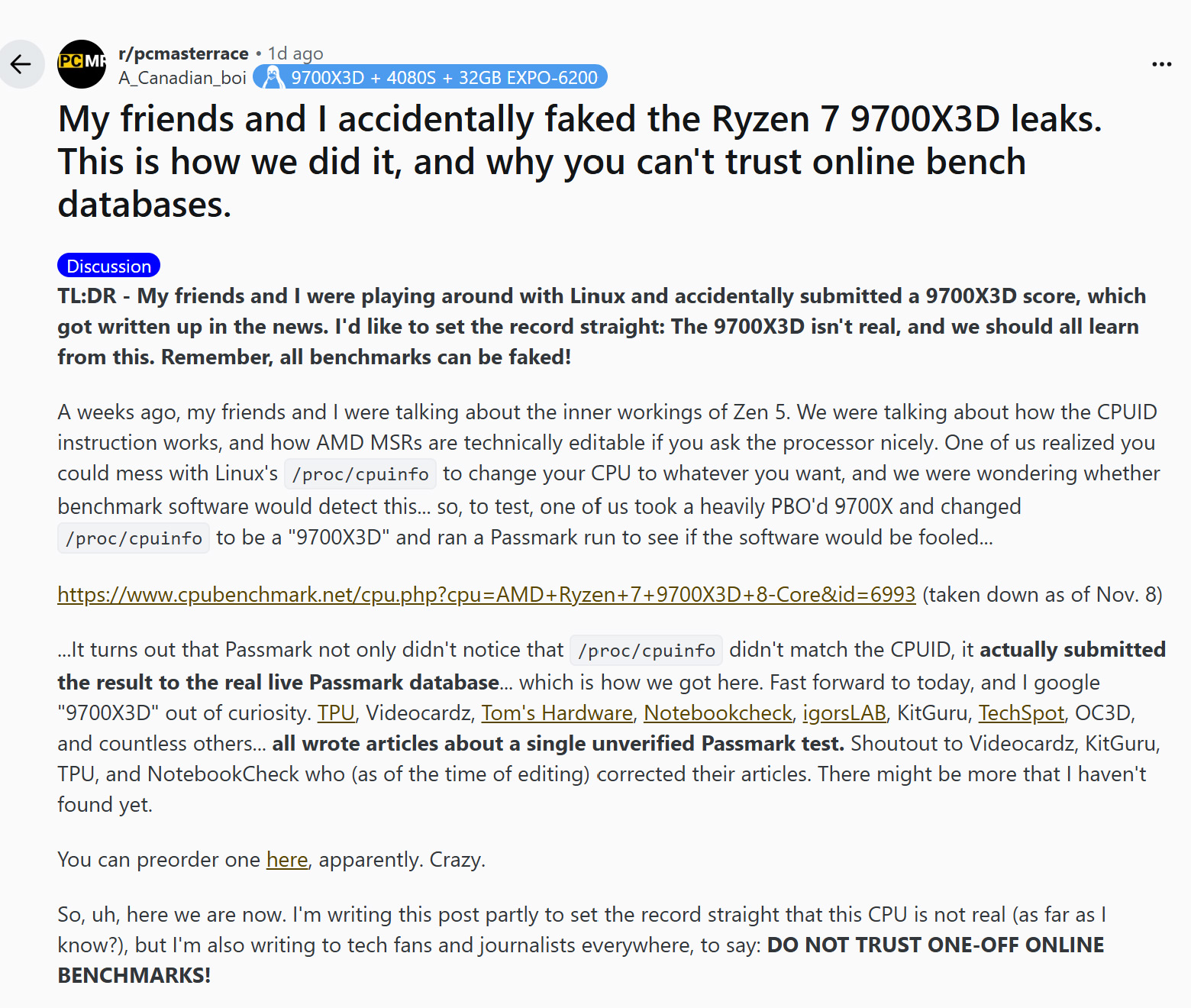 Изложу суть вкратце. Ребята обсуждали, как можно изменить название процессора в Linux, каким образом эта информация обрабатывается системой и сторонними приложениями. И создали новый процессор 9700X3D от AMD (в реальности это был другой, более мощный процессор), который пропустили через один из бенчмарков, результаты появились в онлайн-базе, тут же были замечены новостными изданиями, а дальше сработал простой механизм: все стали копировать чужую новость, не пытаясь даже осознать что-либо. Что интересно, после сеанса разоблачения большинство новостей не были изменены, они остались висеть ровно в том же виде. В них описывается несуществующий процессор, люди рассуждают о его возможностях.