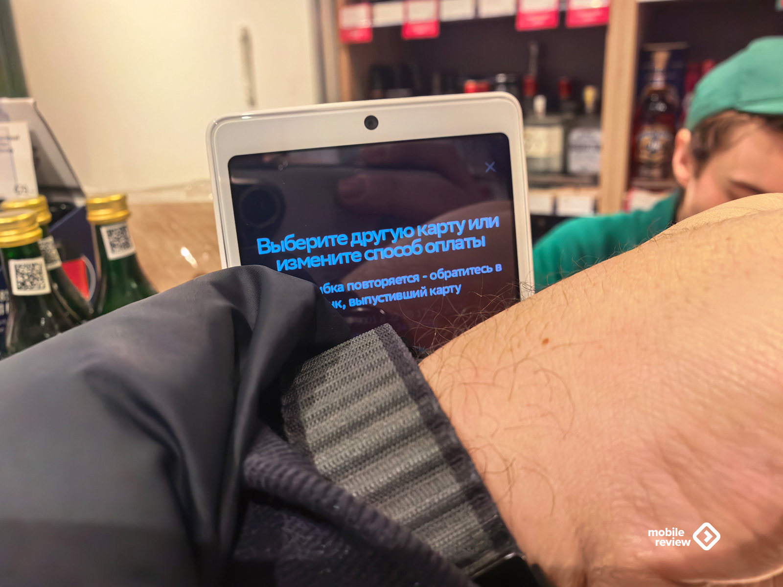 Механика ровно такая же, нужно запустить приложение на часах, потом приложить их к терминалу оплаты. Не знаю, то ли проблема тестового периода, то ли что-то еще, но решение от «Яндекса» периодически зависало и показывало сообщение, что оплата невозможна. Ощущение, что часы не могли достучаться до сервера.