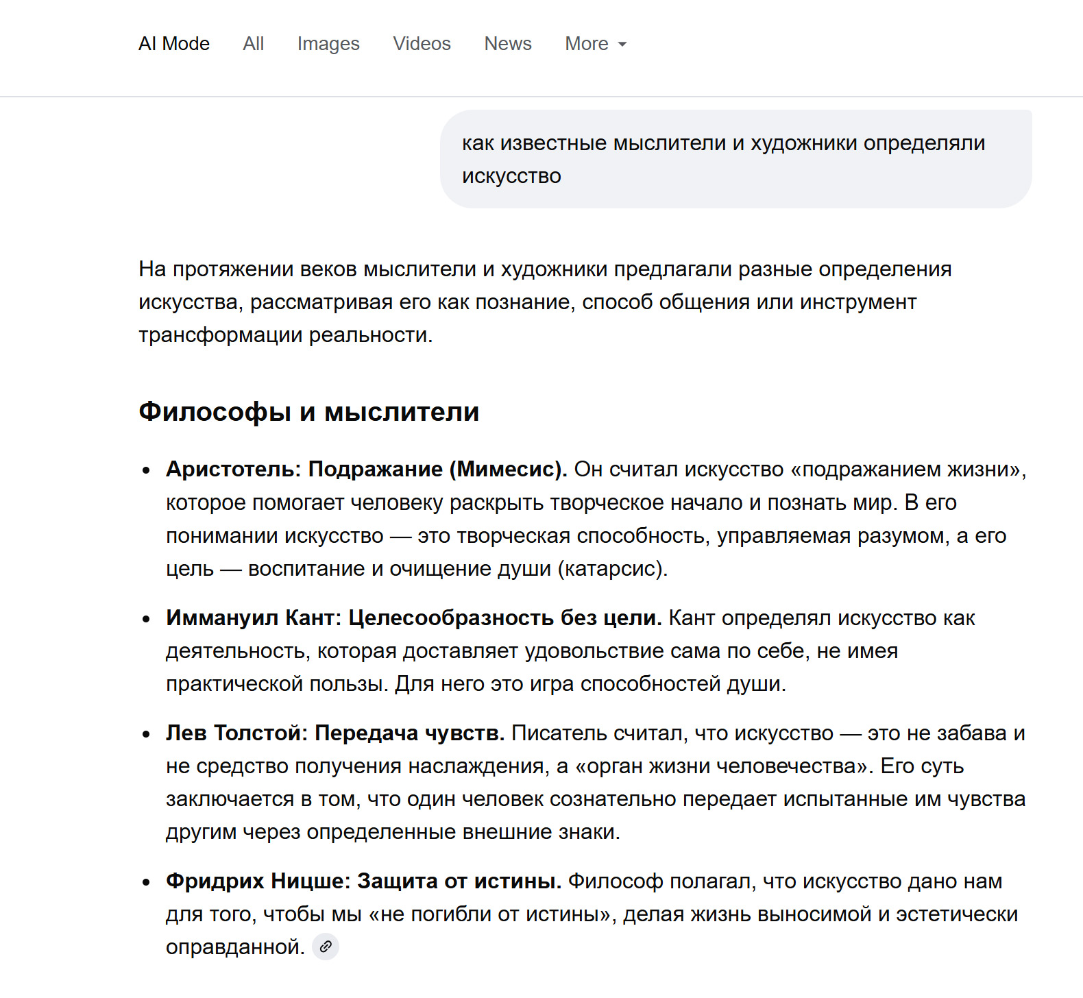 А вот так выглядит результат запроса: «Напиши статью про определение искусства с цитатами мыслителей и художников, без параграфов, только текст с цитатами».