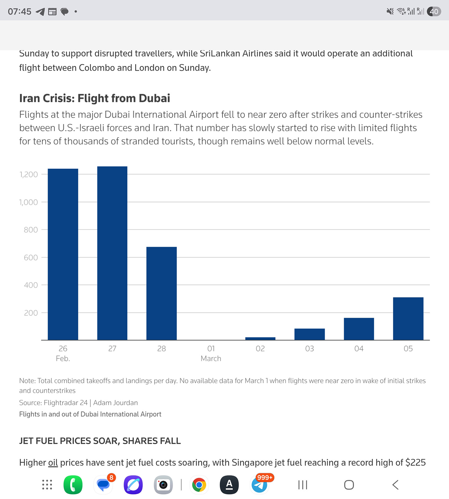 Последнее, о чем стоит вспомнить. Миф о Дубае как о ближневосточной Швейцарии рассыпался, оказывается, город не способен жить без транспортных коммуникаций. Люди не могут вернуться домой в Дубай, а также не могут выехать оттуда, они оказались в ловушке. Вывозные рейсы постепенно разгружают отели, последние взвинтили цены, так как пытаются компенсировать свои потери. Заявляют о том, что свежих овощей осталось на десять дней, так как все привозится морем или транспортными самолетами. Не думаю, что начнется голод, запасов еды точно хватит, но вот ее разнообразие будет оставлять желать лучшего. Посмотрите на количество рейсов после начала войны.