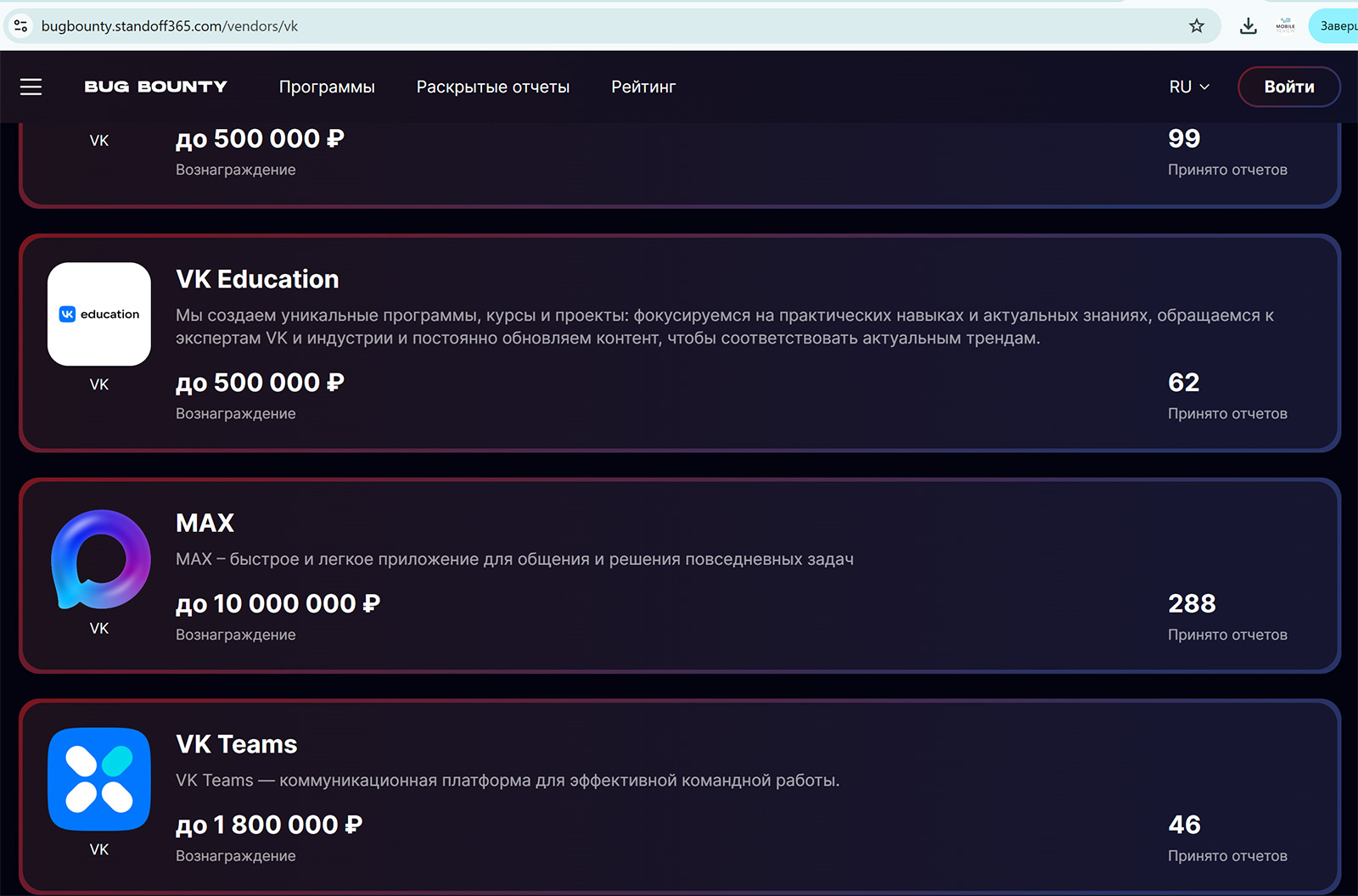 На платформе Bug Bounty Standoff365, принадлежащей Positive Technologies, размещены странички разных компаний и продуктов, в разделе VK можно увидеть и результаты, озвученные Алексеем Батюком.