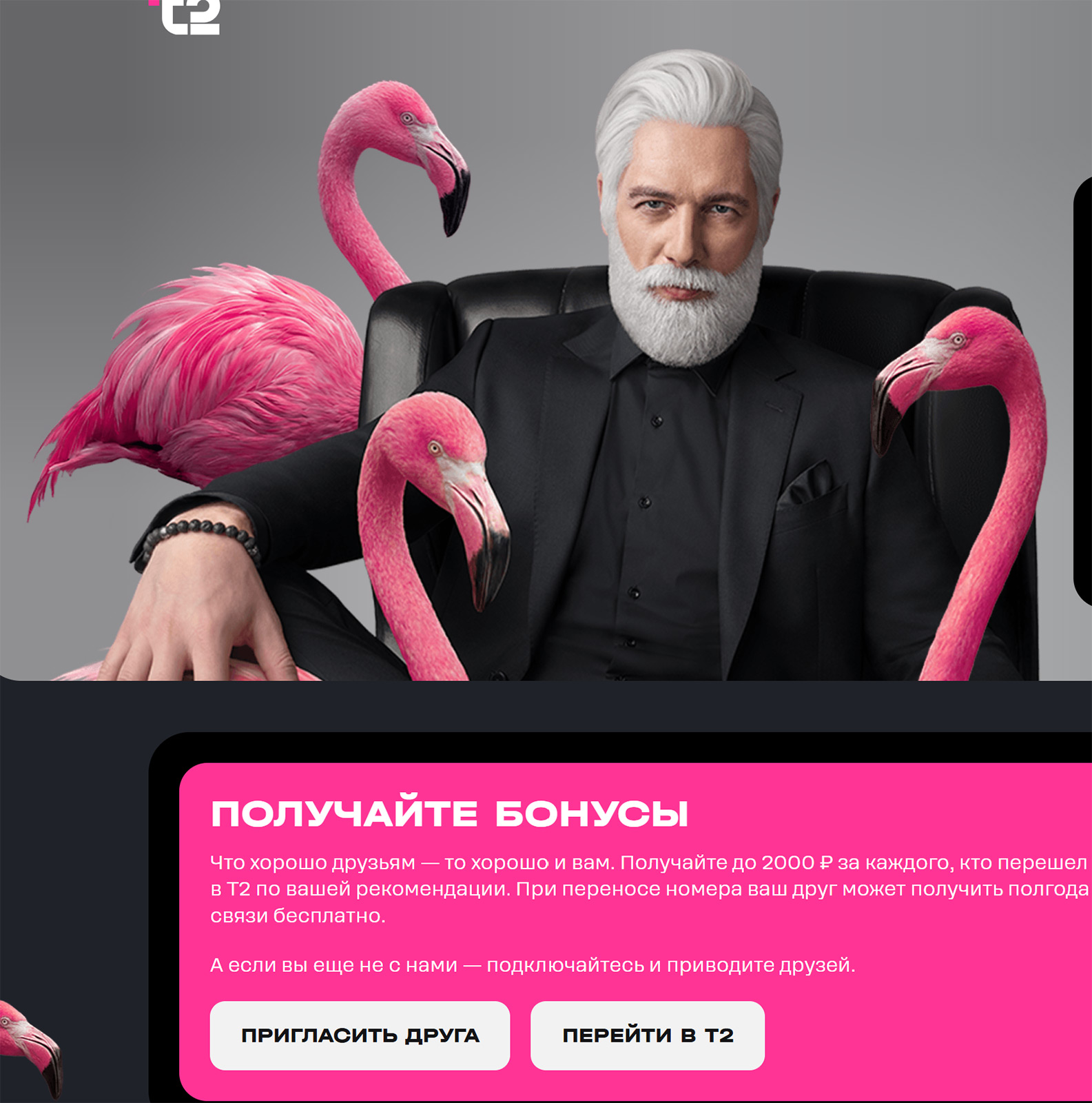 Но все операторы пытаются ответить на вопрос выгоды для абонента, убрать денежные издержки. В Т2 поступили просто: для новых абонентов дают полгода бесплатной связи, предложение, без всяких сомнений, таково, что перебить его практически невозможно. Но в Т2 решили добавить огня — запустили реферальную программу для частных лиц. Приводите нового абонента, он использует ваш промокод, и вуаля, вы получаете на свой счет от 500 до 2000 рублей в зависимости от выбранного человеком тарифа. Оговорюсь, что при этом приведенный вами человек со второго месяца получает те самые полгода бесплатной связи.