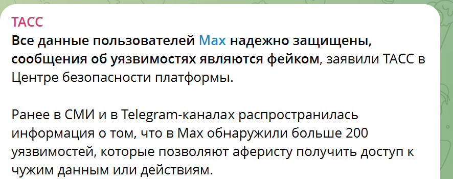 Центр безопасности MAX всегда старается опровергнуть любую информацию о недостатках мессенджера, в этом случае вышло ровно так. Читаем заметку в ТАСС.
