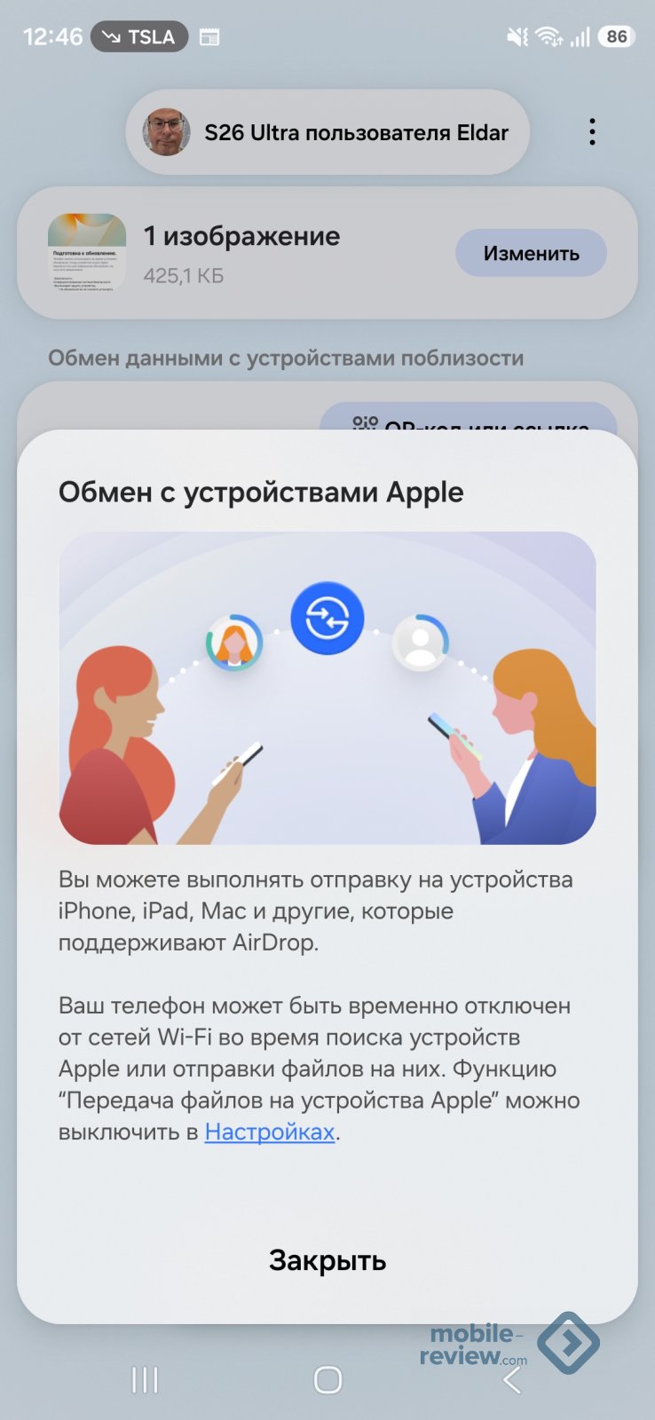 Началось все с ошибки, обновление прилетело, но ничто не работало. В течение недели появился специальный профиль для ряда стран, включая Россию и все зафурычило. Подсказка, нужно, чтобы на Apple была выставлена видимость для всех, также и на Samsung. Отправить и получить любые файлы не составит труда, задействуется функция Quick Share, причем устройства видят друг друга, быстро передают файлы (задействуют WiFi Direct).