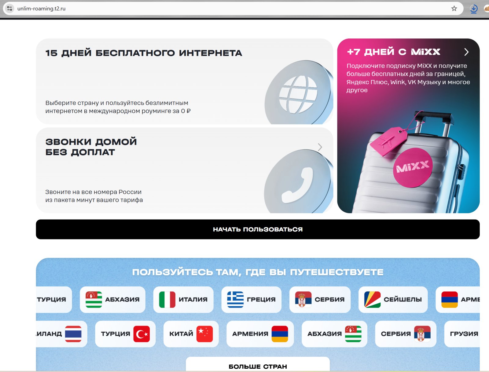 На неделе в Т2 пошли дальше и сделали роуминг бесплатным на две недели, но с рядом оговорок. Начну с того, что это акция для всех существующих абонентов актуальных тарифов Black, Premium, “Везде онлайн», «Мой онлайн+», плюс есть она же на ряде корпоративных тарифов. Роуминг за ноль действует до 15 дней в 34 странах (основные популярные направления туризма). Период с настоящего времени по конец июля, то есть это именно акция. Если есть подписка MiXX из актуальных, то накинут еще дополнительно неделю роуминга.