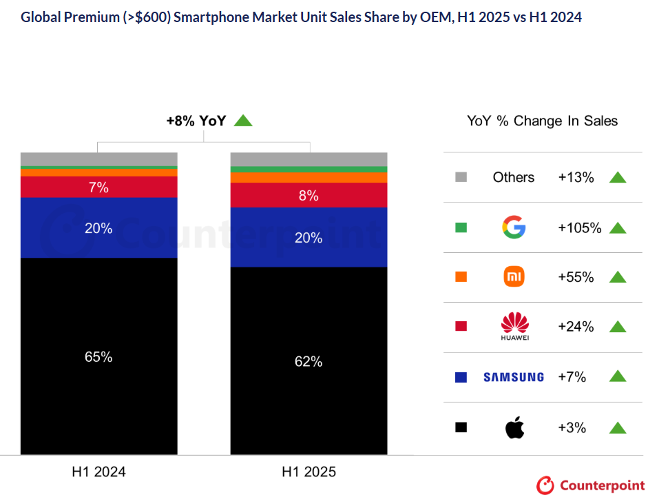 Все блогеры и обзорщики восхищаются качеством оптического зума на смартфонах Vivo X100 Ultra и Vivo X200 Ultra, но статистика продаж неумолима. Counterpoint Research поделилась данными для премиум-смартфонов (дороже 600 долларов) за первое полугодие 2025 года.