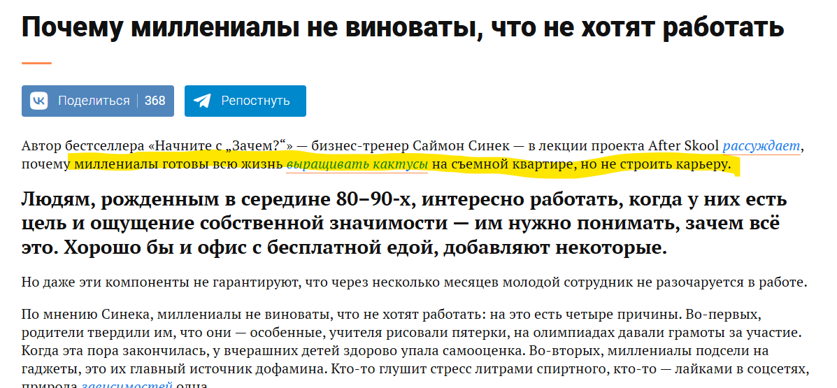 Забавно, как в материале 2010 года, опубликованном на сайте университета Wharton, пишут, что миллениалы выходят на худший (со времен Великой депрессии) рынок труда и никогда им не заработать на квартиру или машину. А в соседнем материале в HarvardBusinessReview указывается, что 37% миллениалов не могут найти работу, так как не хотят идти в токсичные офисы за низкие зарплаты.