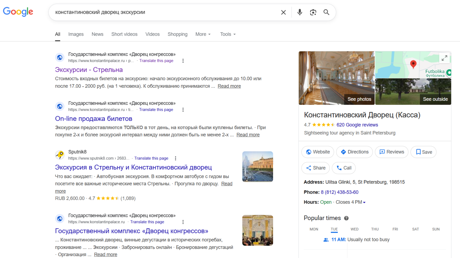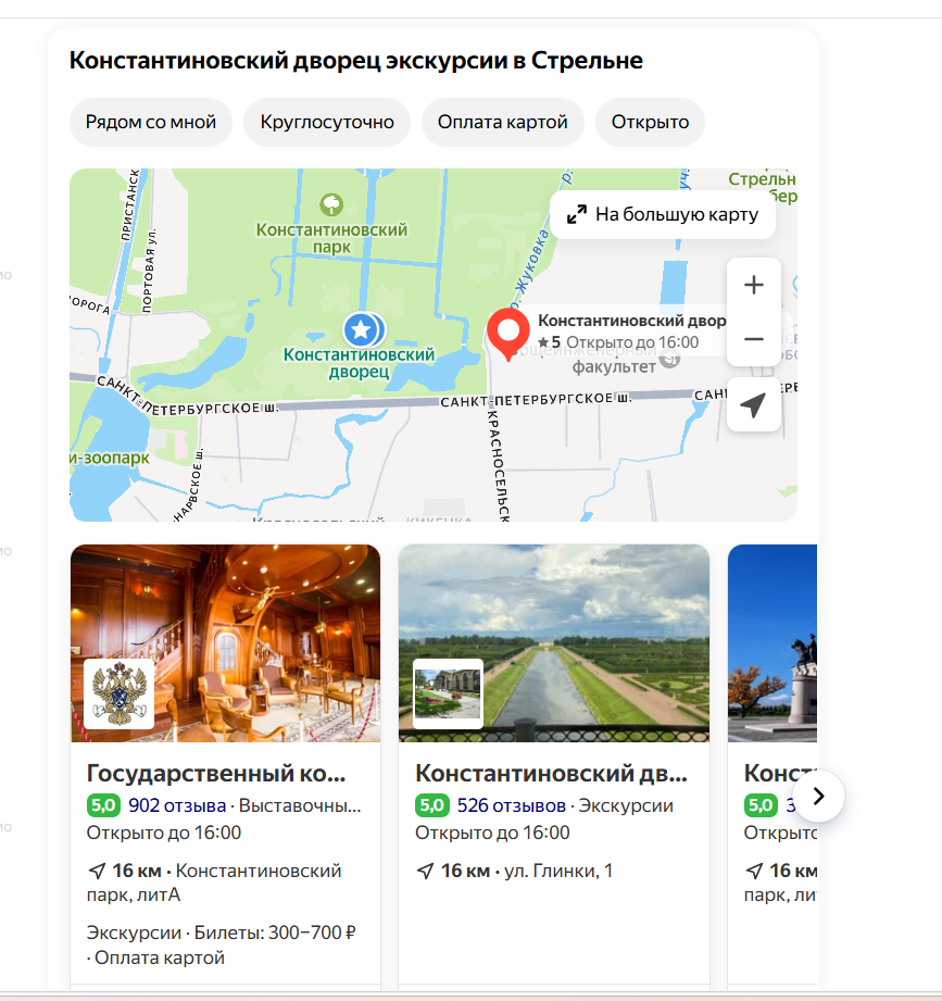 Например, я хочу сходить на экскурсию в Константиновский дворец в Стрельне. В поисковой строке я пишу запрос «константиновский дворец экскурсии». Google сразу мне показывает сайт дворца и даёт прямую ссылку на страницу с экскурсиями. А сбоку отображается сводка, в которой тоже есть ссылка на сайт.