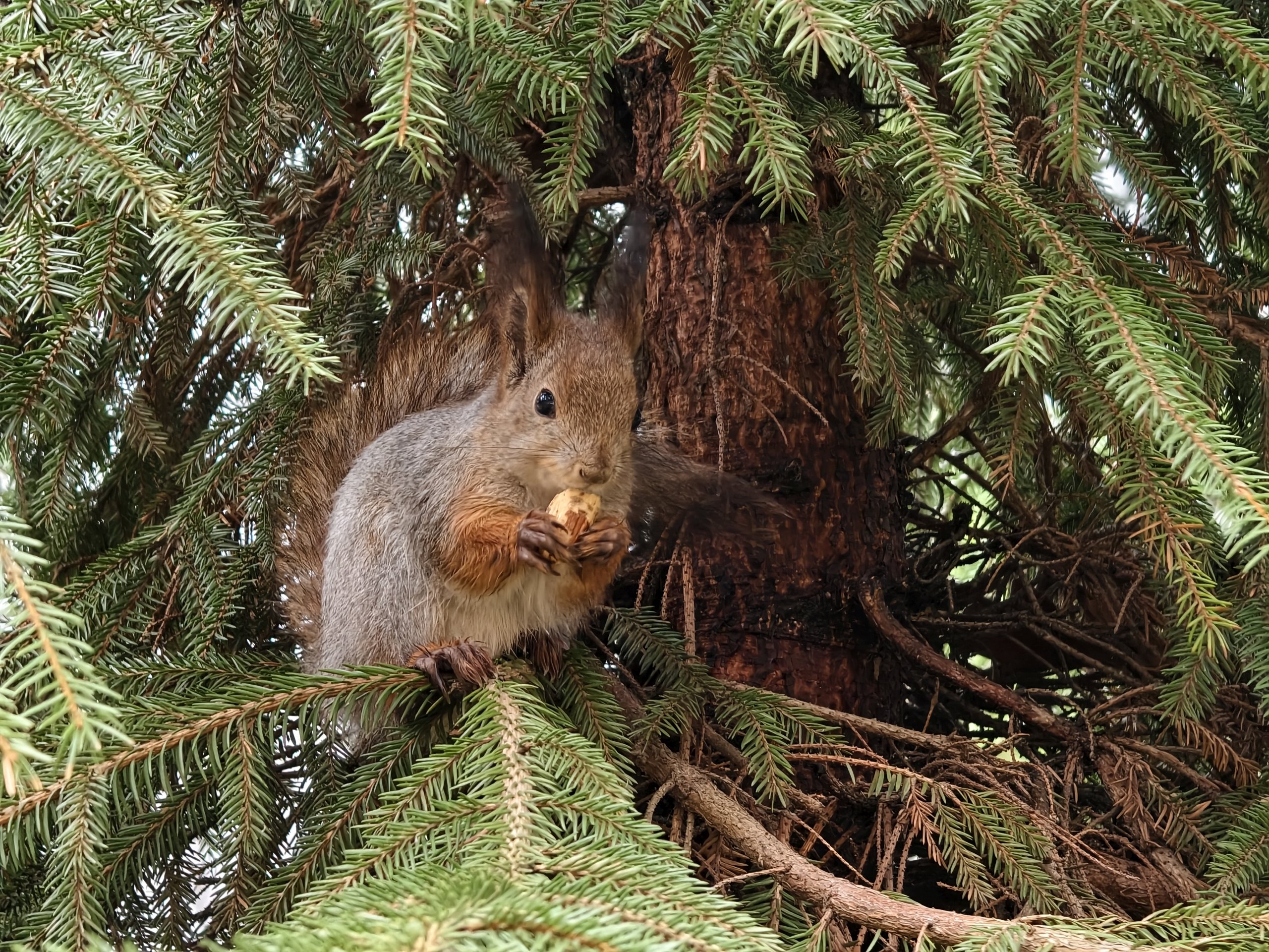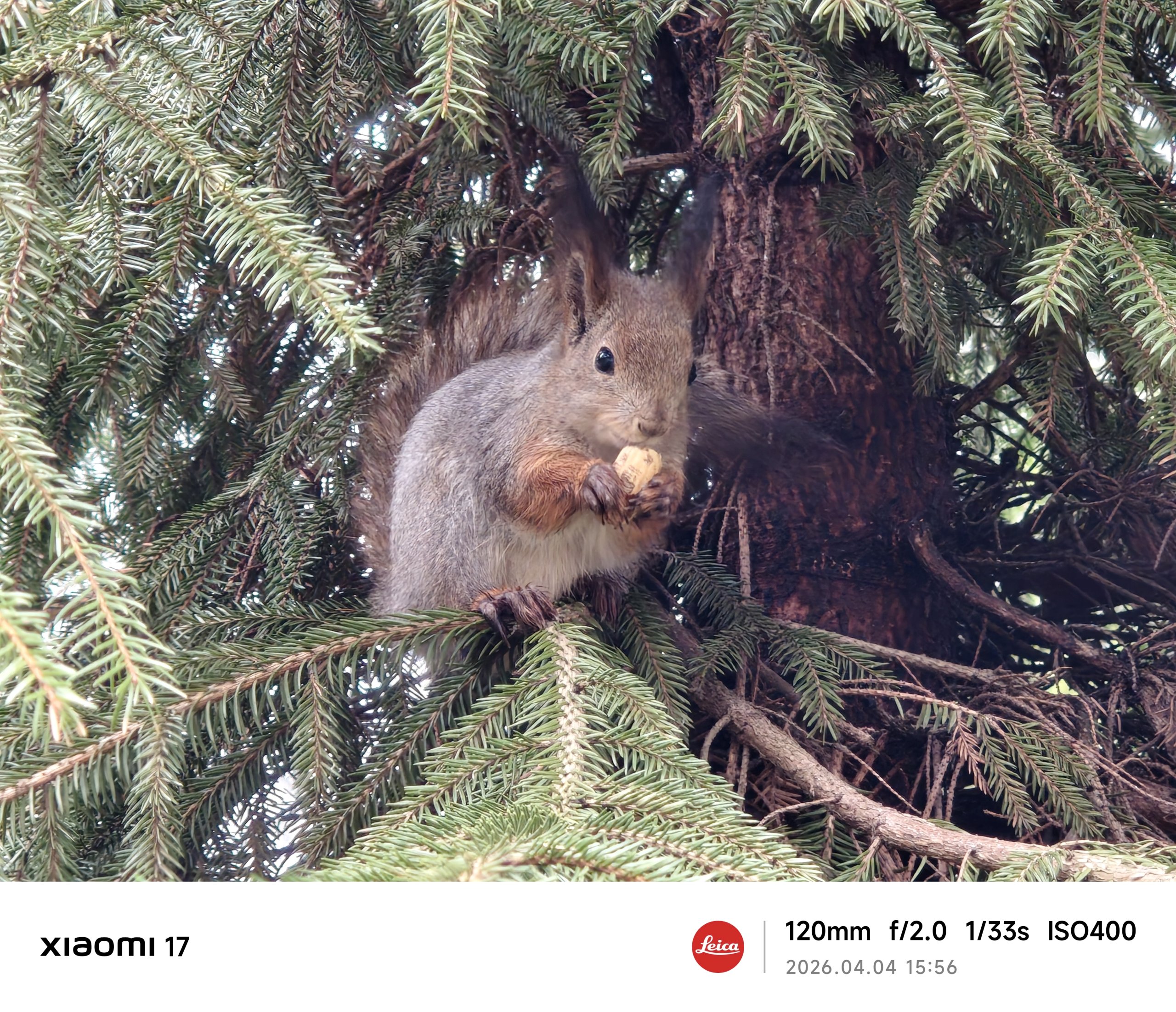 На фото жирная белка в ветках елки в пасмурную погоду. Детализация у фото практически идентичная, но vivo использует подход Apple и Samsung, делая фотографии сочнее. А Xiaomi предпочитает естественность. Вам какая фотография нравится?