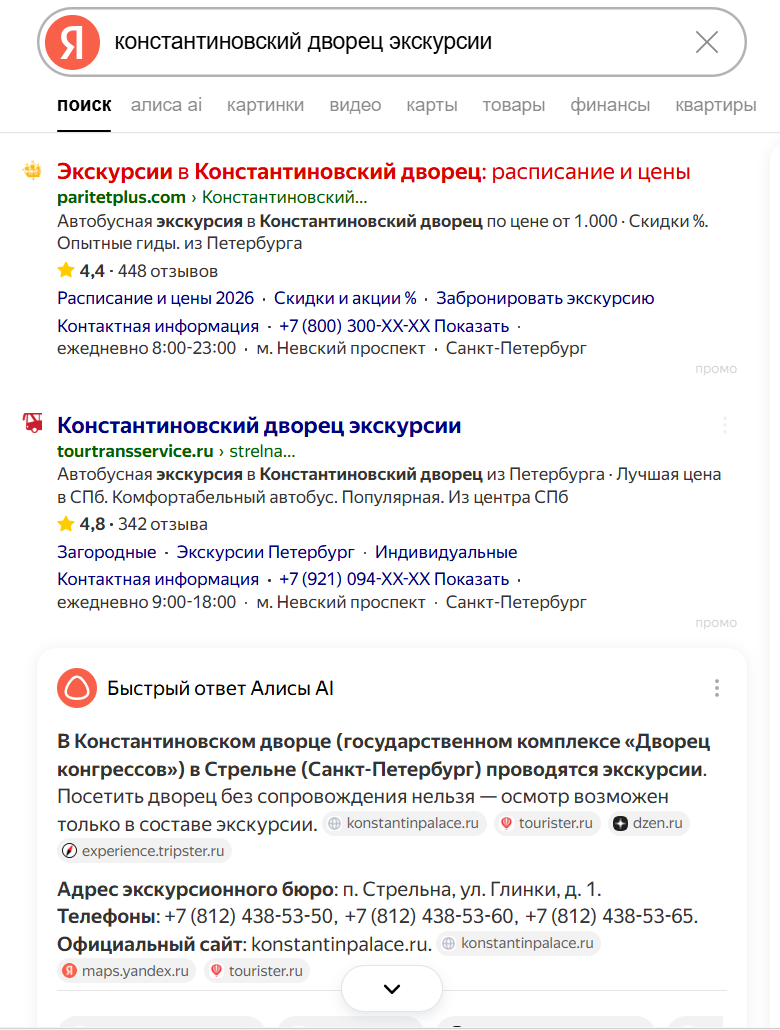 А вот «Яндекс» в первую очередь показывает мне сайт туристической компании «Паритет плюс», затем сайт компании «Турсервис», потом сайт экскурсий «Спутник», потом СНОВА сайт компании «Паритет плюс», потом идет невзрачная блеклая ссылка Константиновского дворца и снова всякие турфирмы. Обратите внимание на скриншот ниже. Напротив коммерческих ссылок — яркие иконки, напротив сайта дворца — еле заметный значок глобуса. Поскольку глаз цепляется за яркие объекты, я первый раз даже случайно пропустил эту ссылку. Можно предположить, что так получилось случайно. Но я вижу в этом умысел. Дело в том, что вряд ли Константиновский дворец вкладывается в продвижение, а вот коммерческие турфирмы — да. И если пользователь не силен «в интернетах», то он откроет коммерческую ссылку, где групповая экскурсия стоит 2400 рублей. В то время как на сайте дворца билет стоит 600 рублей. Конечно, турфирма легко обоснует разницу тем, что предлагает ещё трансфер.
