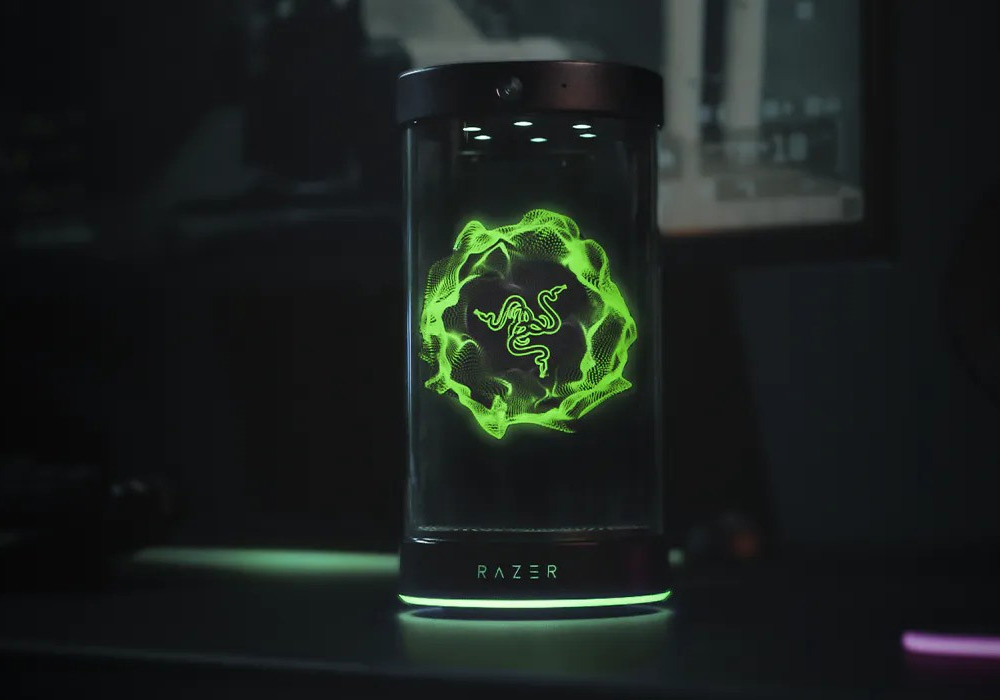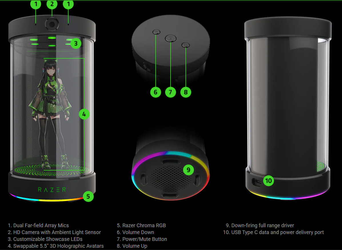 Razer показала Project Ava. Это цилиндр, внутри которого голограмма ИИ-чат-бота. Рост голограммы — 5.5 дюймов, или 14 сантиметров. Голограмма реагирует не только на звуки, но и, используя компьютерное зрение, на происходящее вокруг.
