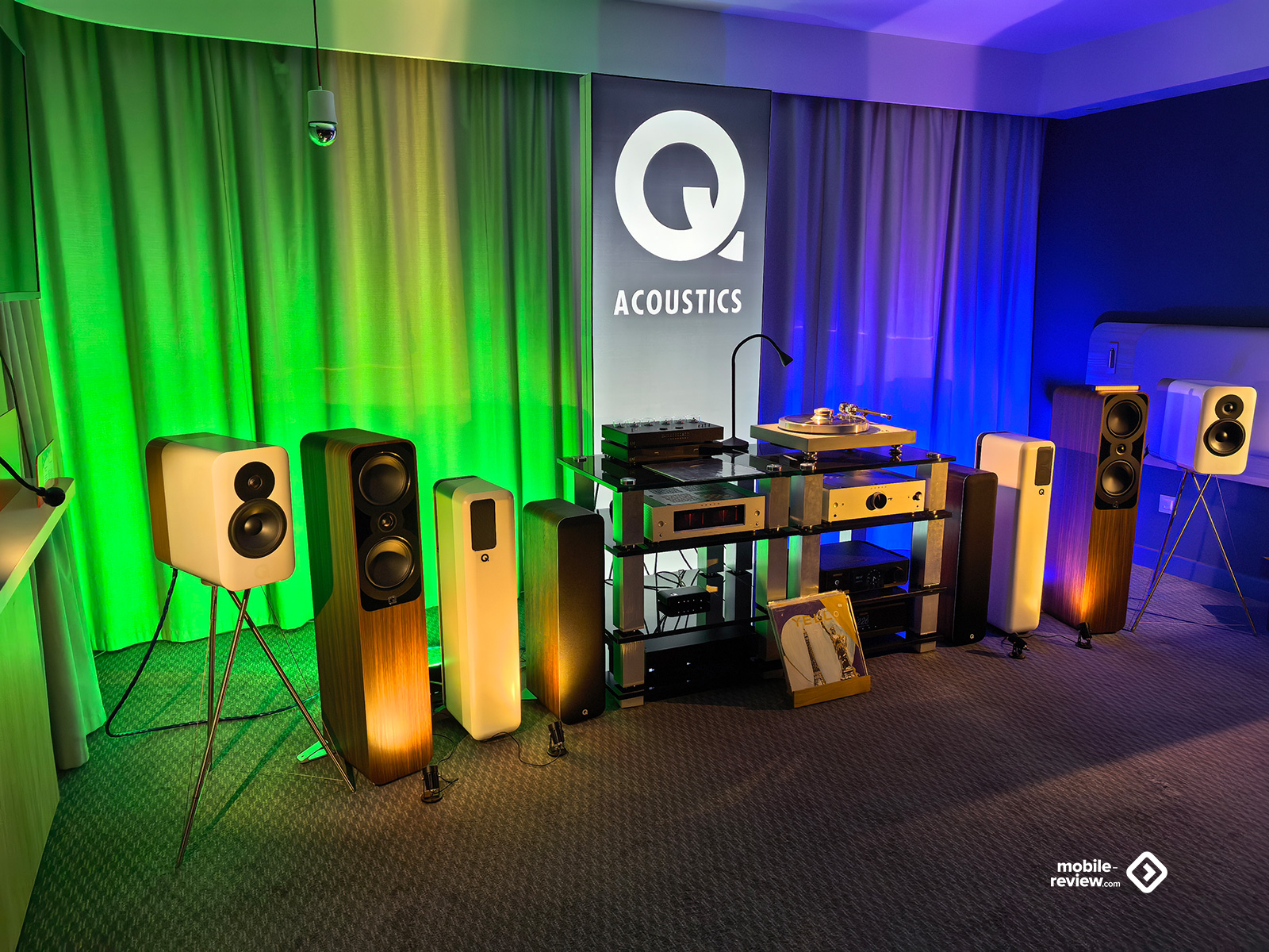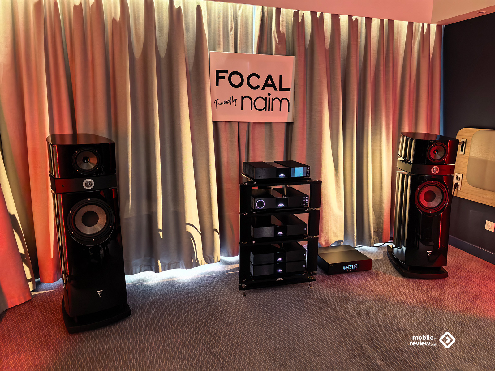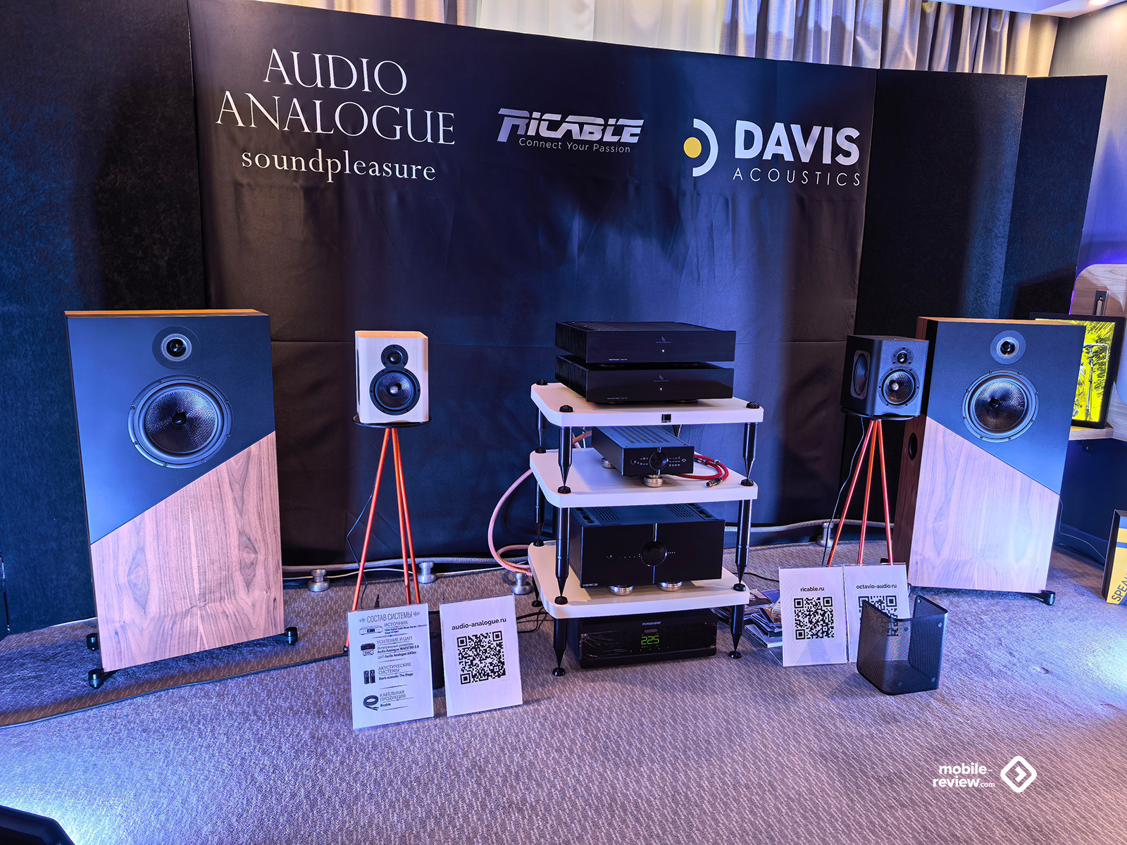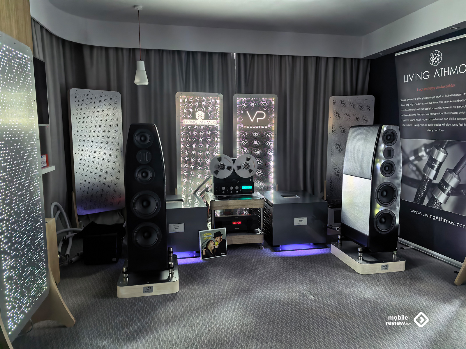 Я не мог обойти этот раздел стороной, так как некоторые вещи выглядят лучше, чем звучат. Например, две комнаты, в которых представляли VP Acoustics, выглядели очень нарядно, жаль, что фото не передаёт всей атмосферы. Что же до звука, то я не фанат баса, откровенно лупящего по ушам и забивающего всё впечатление. Да, настройка в этот раз откровенно слабая. Аналогичная проблема была и у Vienna Acoustics от Pult.ru: очень агрессивный и резкий звук, превращающий классические роковые композиции в нечто неудобоваримое, но при этом антураж, импровизированные кулисы на входе, неон и всё такое. Получше обстояли дела у Q Acoustics: приятная комната с подсветкой, приятные по виду колонки, но, конечно, звук у них не дотягивает по уровню до их стоимости. Субъективно, согласен, да и упор они делают на беспроводное подключение, но всё-таки простенько звучит. Слабовато. В ту же категорию могу отправить французские Cabasse, которые выглядят интересно, но звучат абсолютно не на свои деньги.