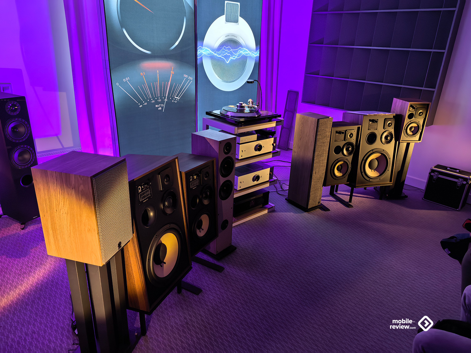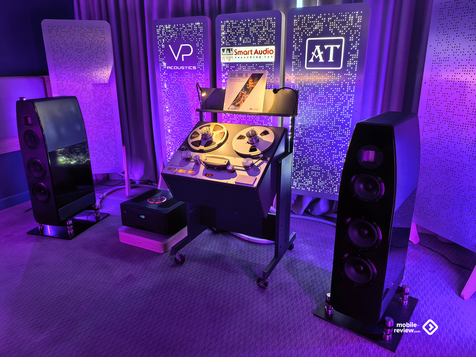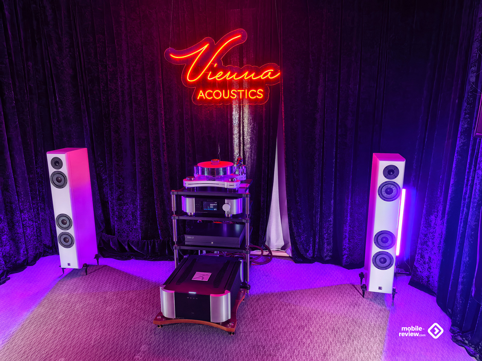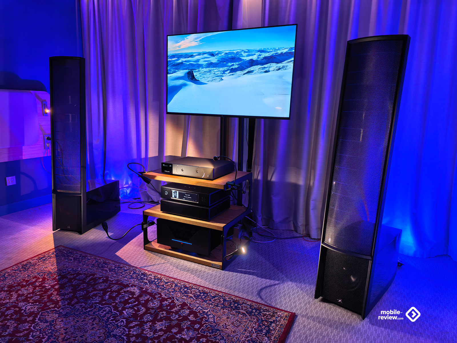 Я не мог обойти этот раздел стороной, так как некоторые вещи выглядят лучше, чем звучат. Например, две комнаты, в которых представляли VP Acoustics, выглядели очень нарядно, жаль, что фото не передаёт всей атмосферы. Что же до звука, то я не фанат баса, откровенно лупящего по ушам и забивающего всё впечатление. Да, настройка в этот раз откровенно слабая. Аналогичная проблема была и у Vienna Acoustics от Pult.ru: очень агрессивный и резкий звук, превращающий классические роковые композиции в нечто неудобоваримое, но при этом антураж, импровизированные кулисы на входе, неон и всё такое. Получше обстояли дела у Q Acoustics: приятная комната с подсветкой, приятные по виду колонки, но, конечно, звук у них не дотягивает по уровню до их стоимости. Субъективно, согласен, да и упор они делают на беспроводное подключение, но всё-таки простенько звучит. Слабовато. В ту же категорию могу отправить французские Cabasse, которые выглядят интересно, но звучат абсолютно не на свои деньги.