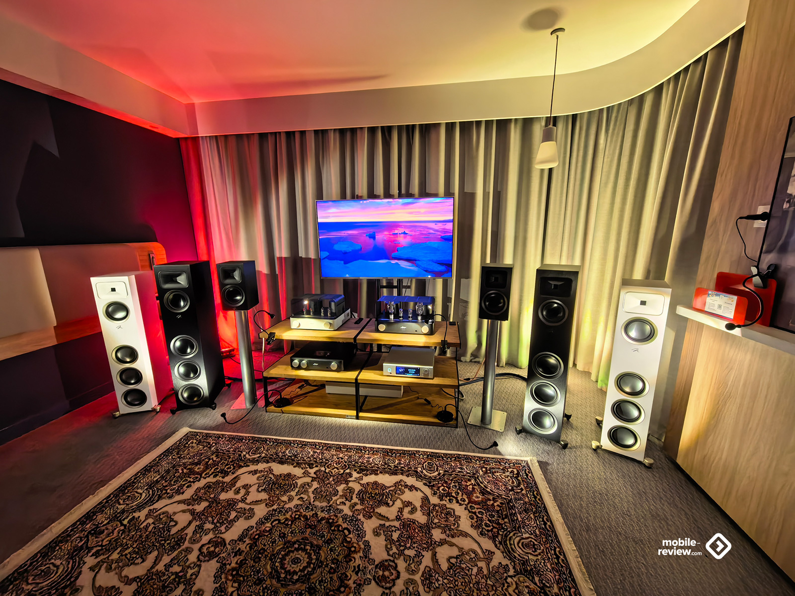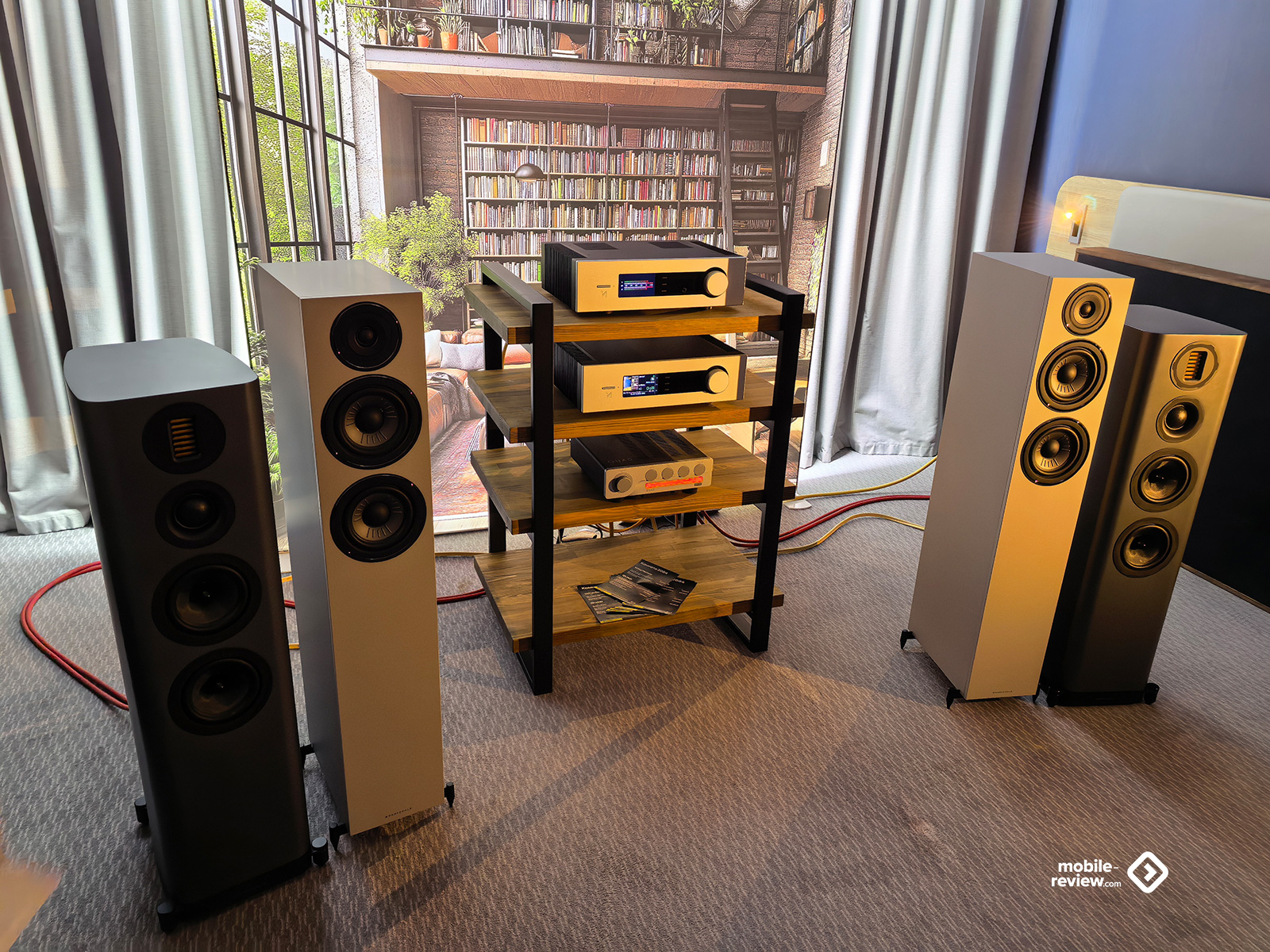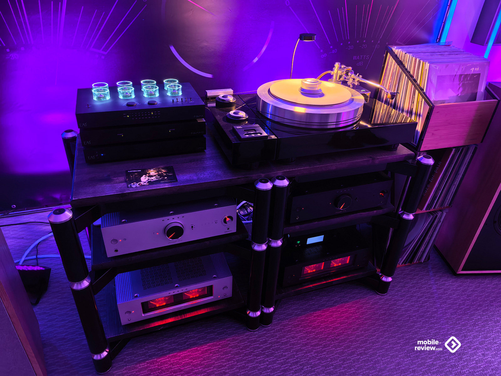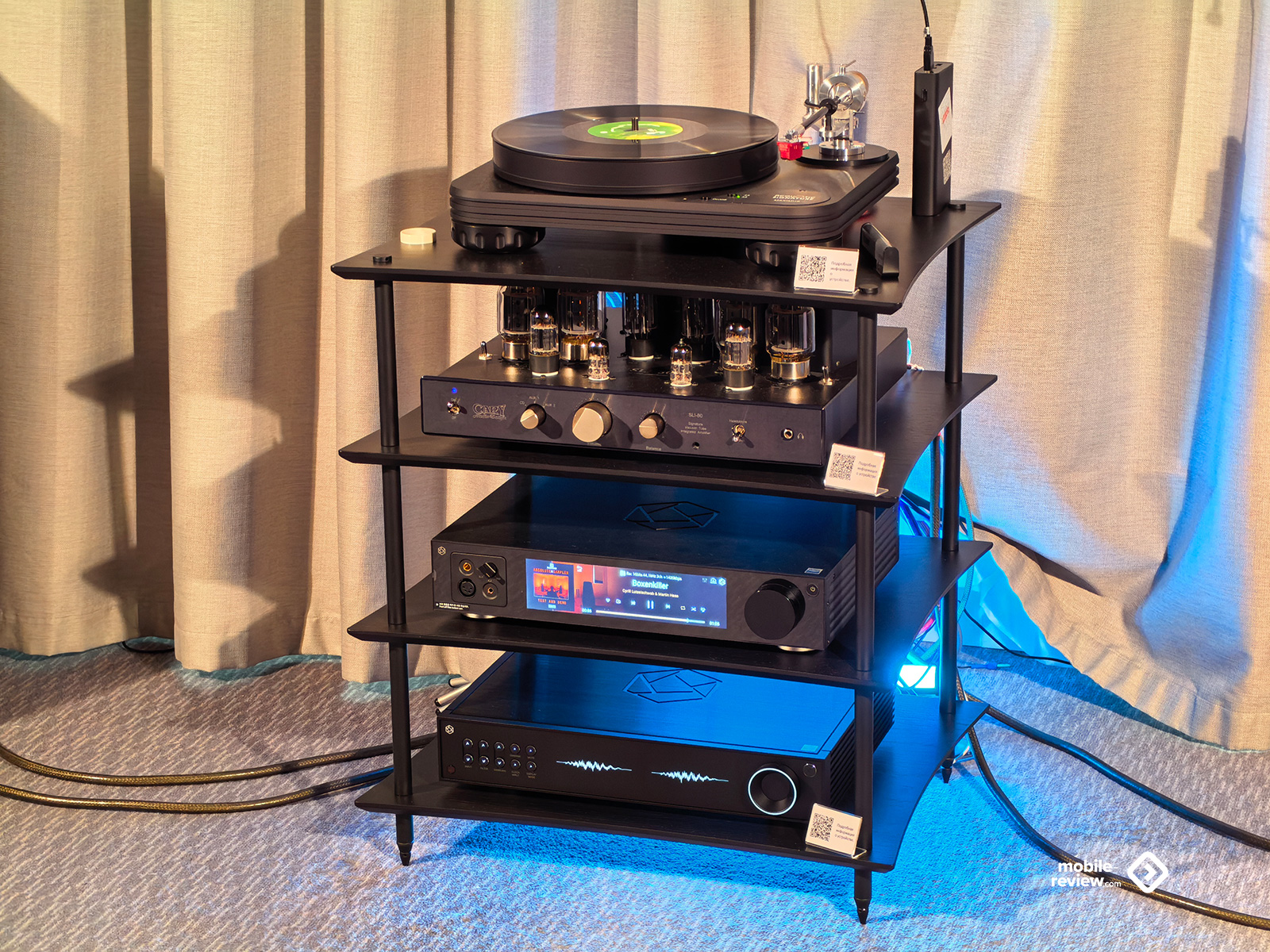 Я не мог обойти этот раздел стороной, так как некоторые вещи выглядят лучше, чем звучат. Например, две комнаты, в которых представляли VP Acoustics, выглядели очень нарядно, жаль, что фото не передаёт всей атмосферы. Что же до звука, то я не фанат баса, откровенно лупящего по ушам и забивающего всё впечатление. Да, настройка в этот раз откровенно слабая. Аналогичная проблема была и у Vienna Acoustics от Pult.ru: очень агрессивный и резкий звук, превращающий классические роковые композиции в нечто неудобоваримое, но при этом антураж, импровизированные кулисы на входе, неон и всё такое. Получше обстояли дела у Q Acoustics: приятная комната с подсветкой, приятные по виду колонки, но, конечно, звук у них не дотягивает по уровню до их стоимости. Субъективно, согласен, да и упор они делают на беспроводное подключение, но всё-таки простенько звучит. Слабовато. В ту же категорию могу отправить французские Cabasse, которые выглядят интересно, но звучат абсолютно не на свои деньги.