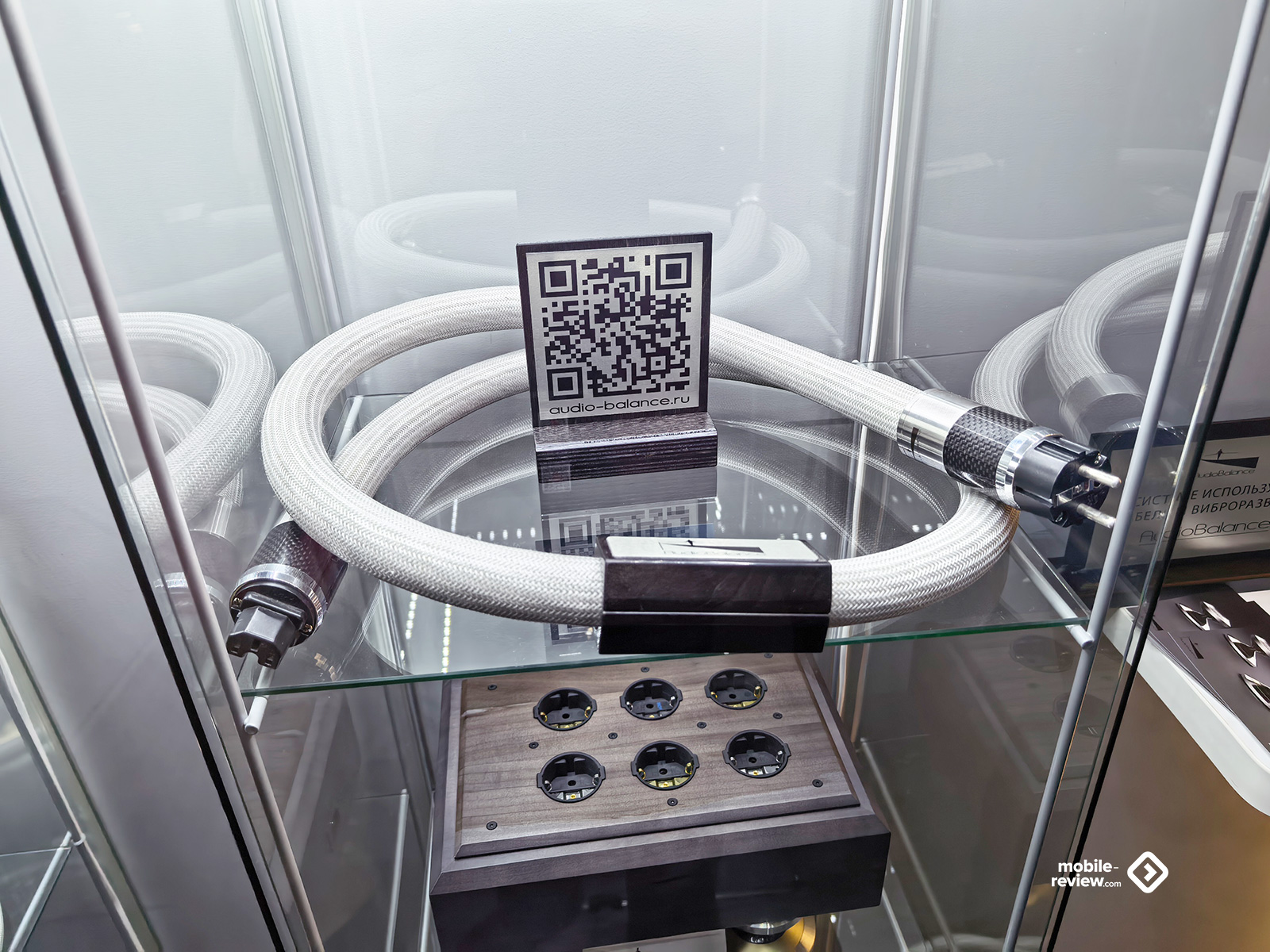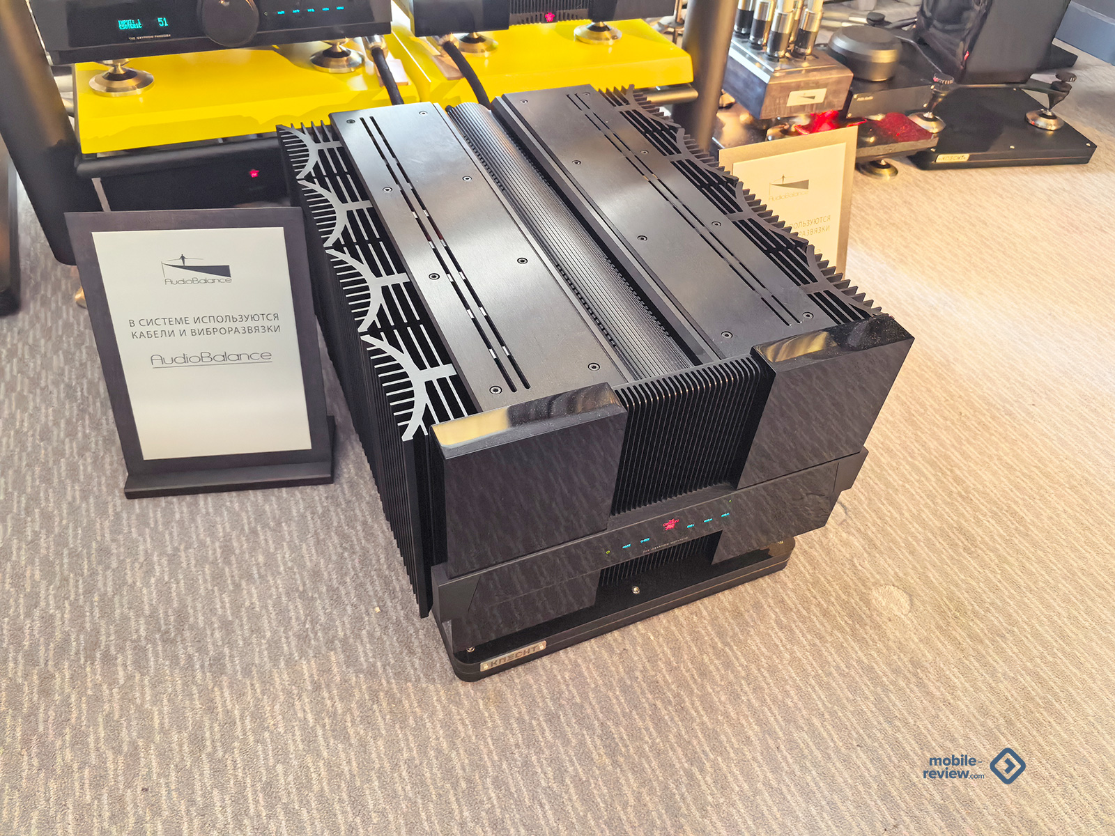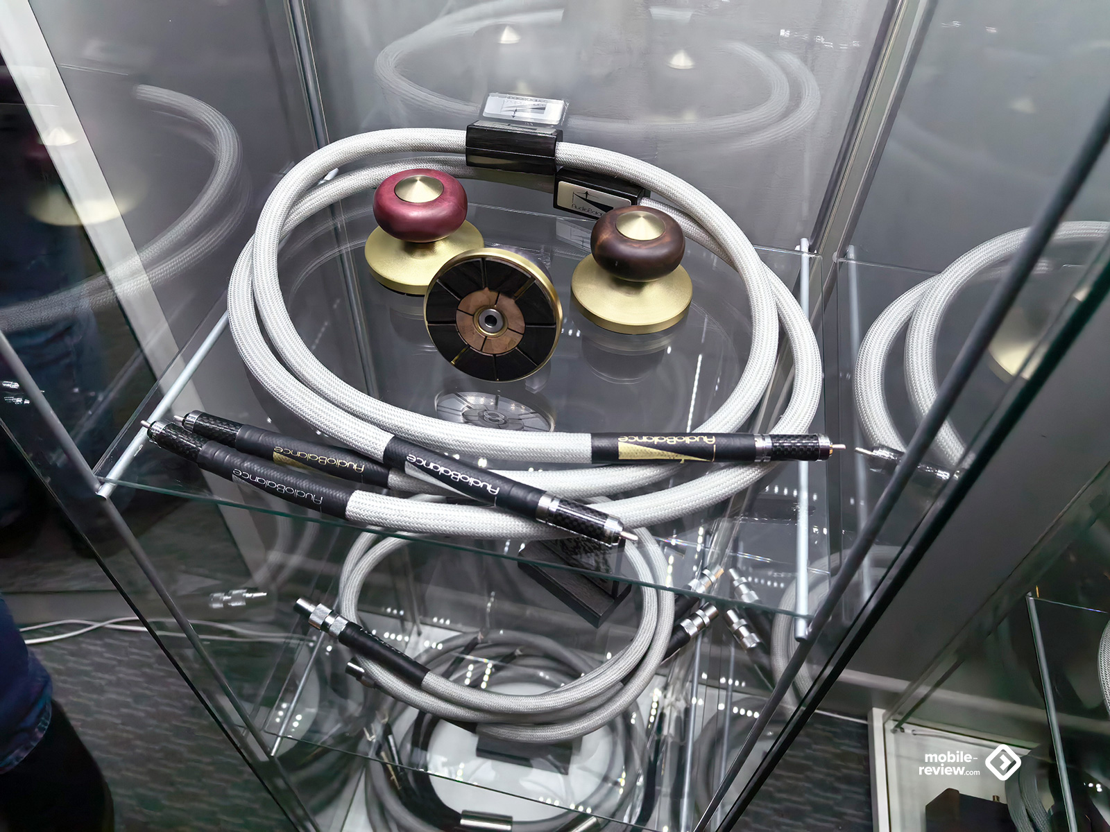 Ну какая аудиовыставка — и без толстенных кабелей? Но даже их было не так и много: только в зале для прослушиваний с супердорогим «сетапом» плюс в одной из комнат выставлялась продукция AudioBalance. Кабели от Nordost тоже были, но, за исключением лекции-презентации, на них не делали заметного акцента. Пара мощных усилителей, стоящих на специальных платформах-виброразвязках от Knecht, внушали уважение своими габаритами, но звучала система при этом довольно посредственно — опять же, проблема качественной настройки. Зато я увидел специальные утяжелители, которые предлагается ставить на верх колонки — чтобы предотвратить вибрации корпуса и не позволить им влиять на колебания твитера. Мол, и верхи становятся прозрачнее, и полётность увеличивается, и вообще благодать акустическая снизойдёт на всех. Не знаю. В тех условиях оценить адекватно разницу было затруднительно, так что остаётся просто поверить. Особенно за эту цену.