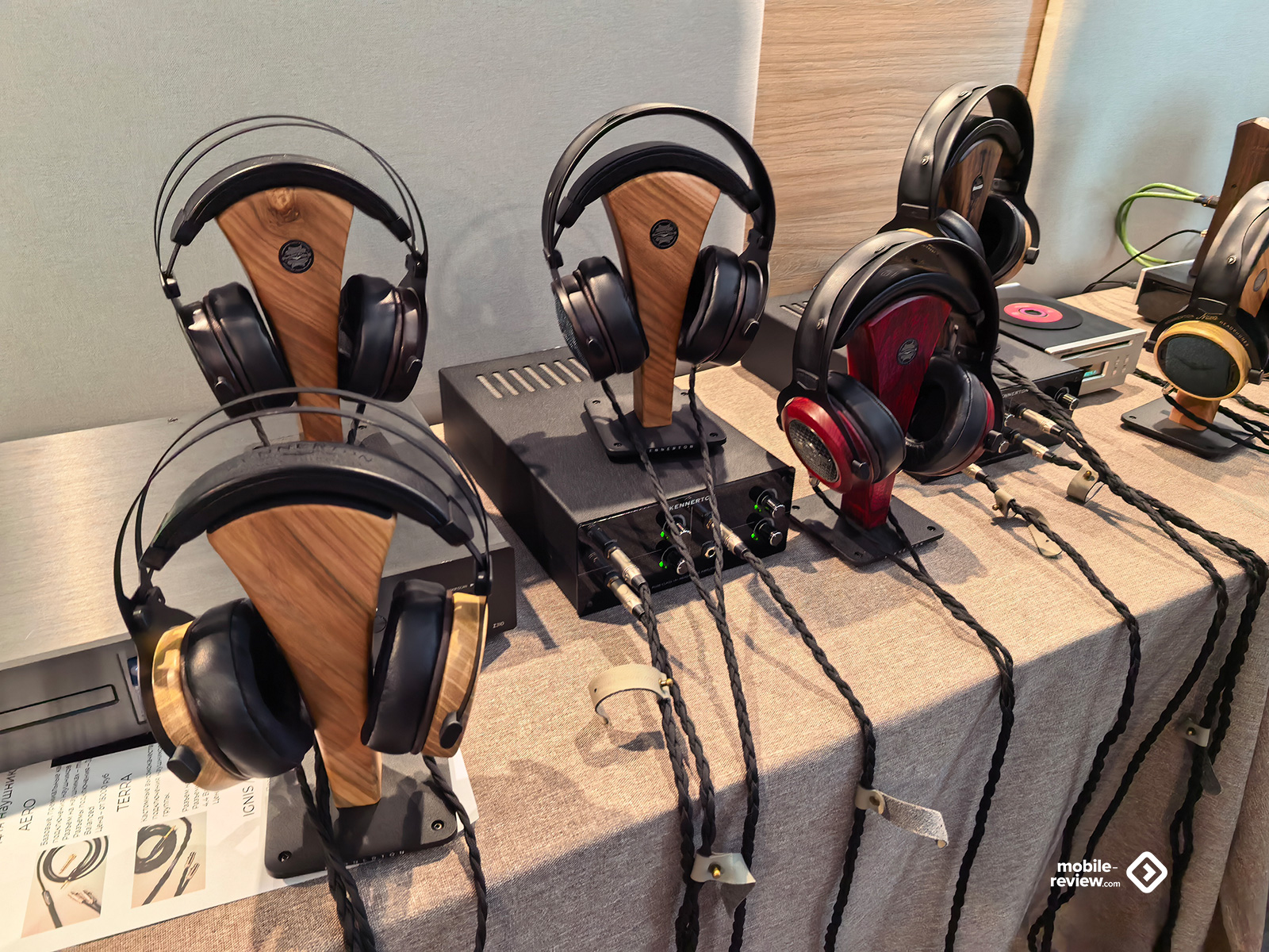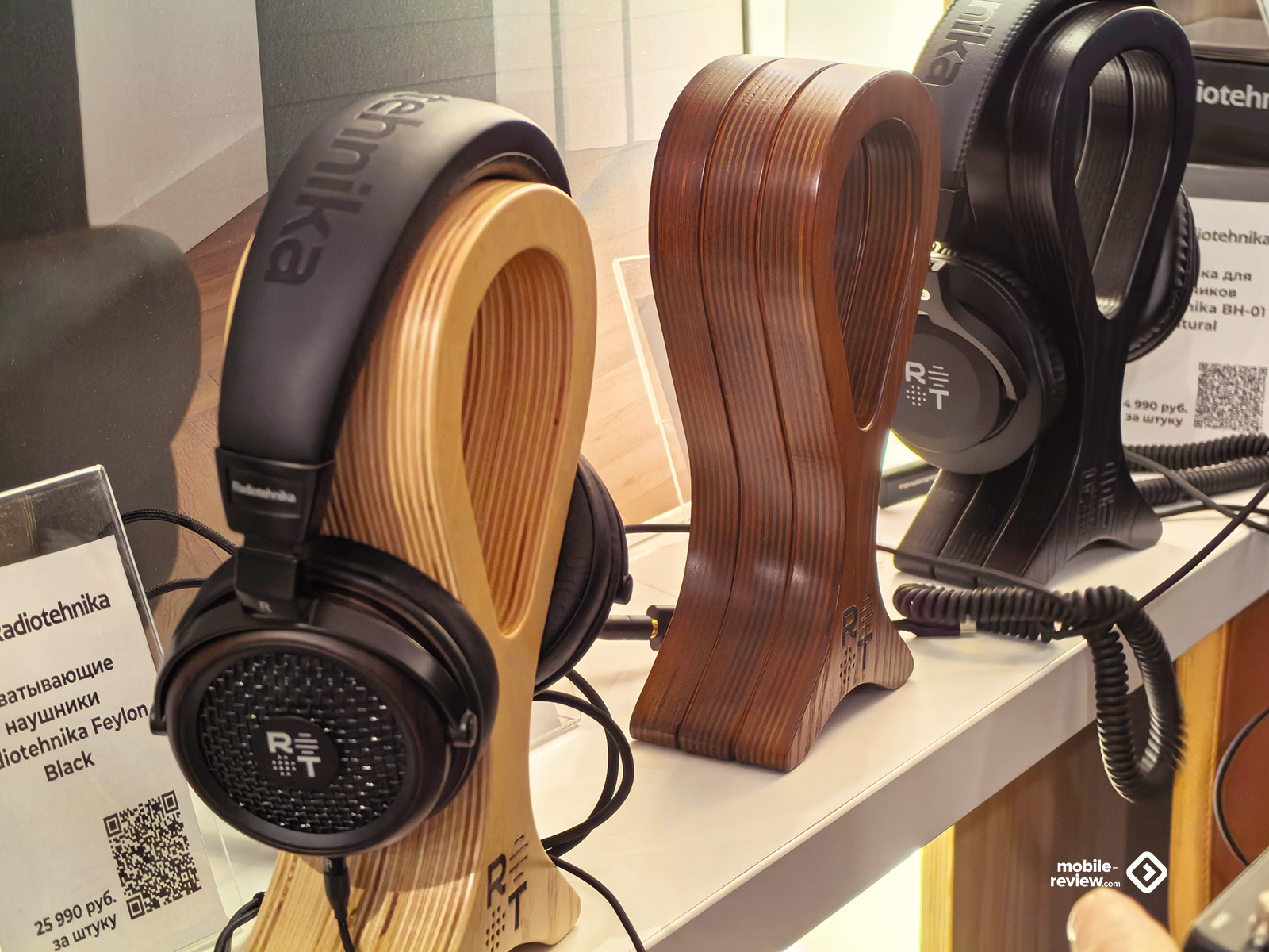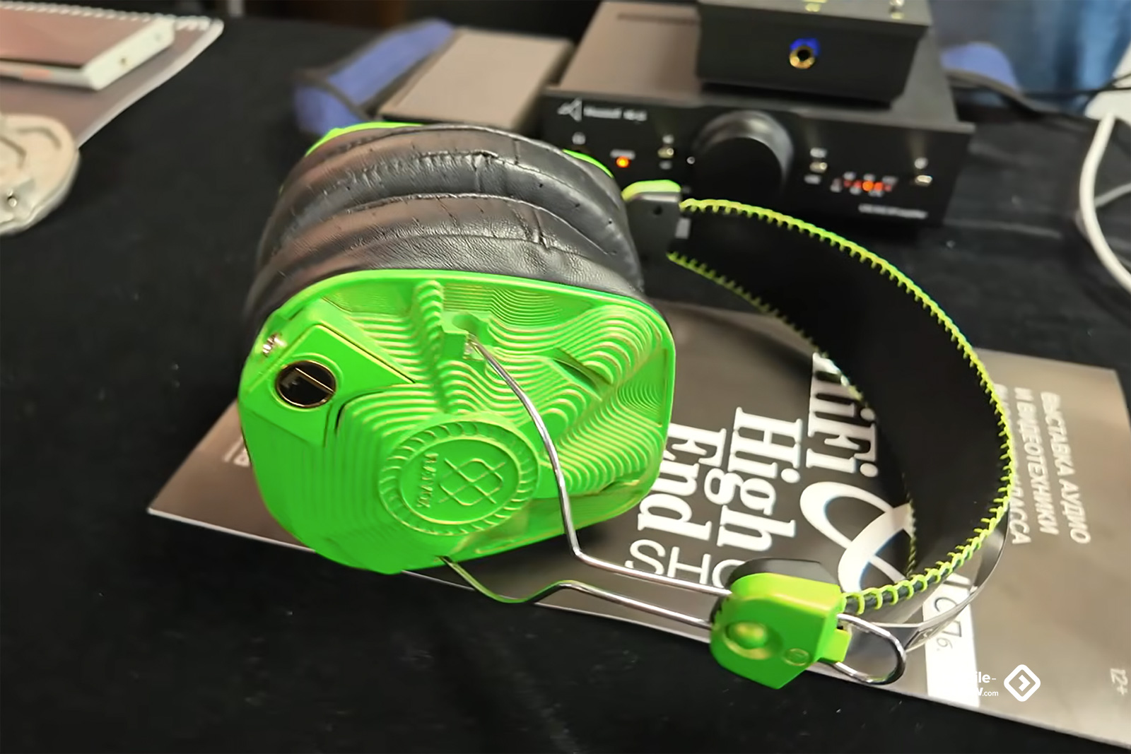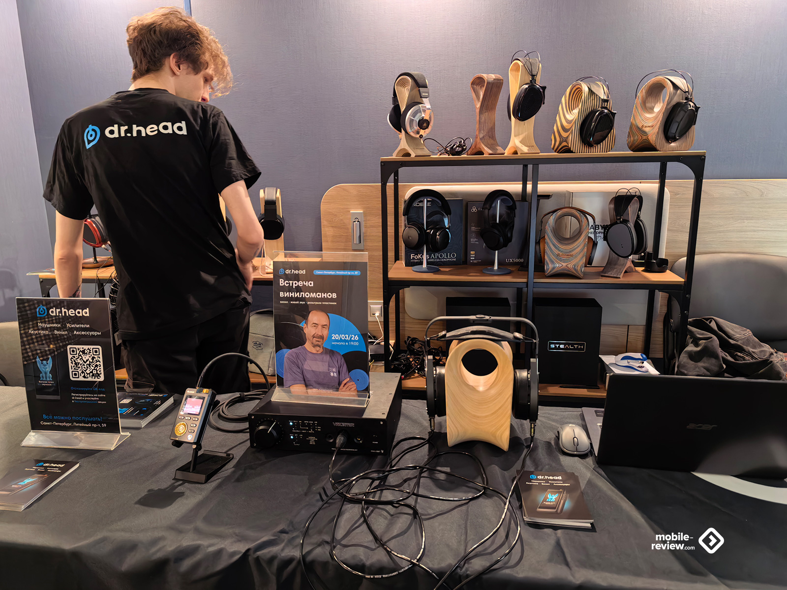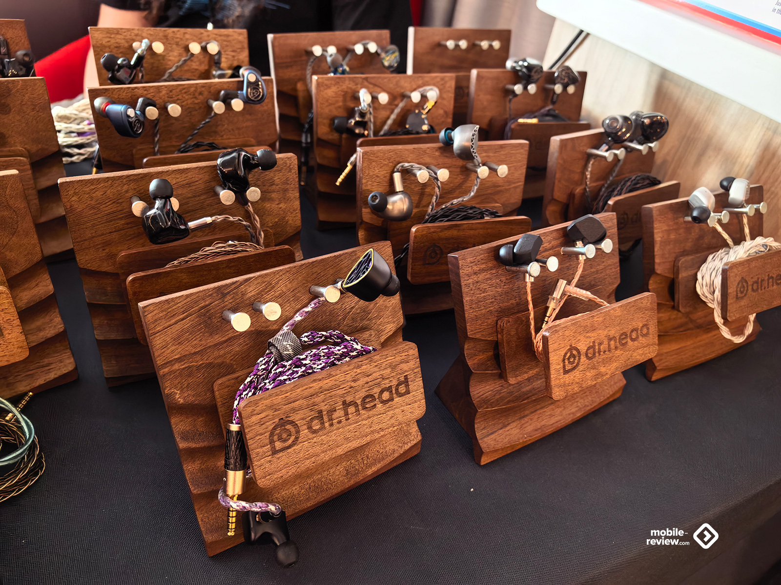 На всякие портативные решения тоже ставку не сделали, а потому присутствовали лишь постоянные игроки. Самый большой — конечно же, Kennerton, он привёз больше всего наушников: и новые модели, и старые, и разные усилители. Ценники, конечно, далеко не бюджетные, но у производителя изначально был прицел на более высокий класс. Пара уже известных наушников от Aleks Audio скромно стояли на столе сбоку от основной их экспозиции, а вот Radiotehnika привезли весь свой пока небольшой ассортимент, включающий три пары в разных ценовых сегментах. От Dr.Head была россыпь внутриканальных моделей и с десяток накладных — разные бренды, разные цены. Приехал и Resopolar — производитель странных наушников с плоским излучателем и напечатанным на 3D-принтере корпусом. Уже не первый год они выставляются и до сих пор выглядят с моей точки зрения как какая-то поделка, особенно в зелёном цвете. И вишенка на торте — жуткий пластиковый манекен в нелепой куртке и таких наушниках, стоящий в проходе. Не знаю, как подобная демонстрация может привлекать, у меня же она вызвала скорее смесь удивления и отвращения, но точно не желание пойти послушать. При этом ни отдельных плееров, ни ЦАПов портативных, ни чего-то подобного не показали. Жаль.