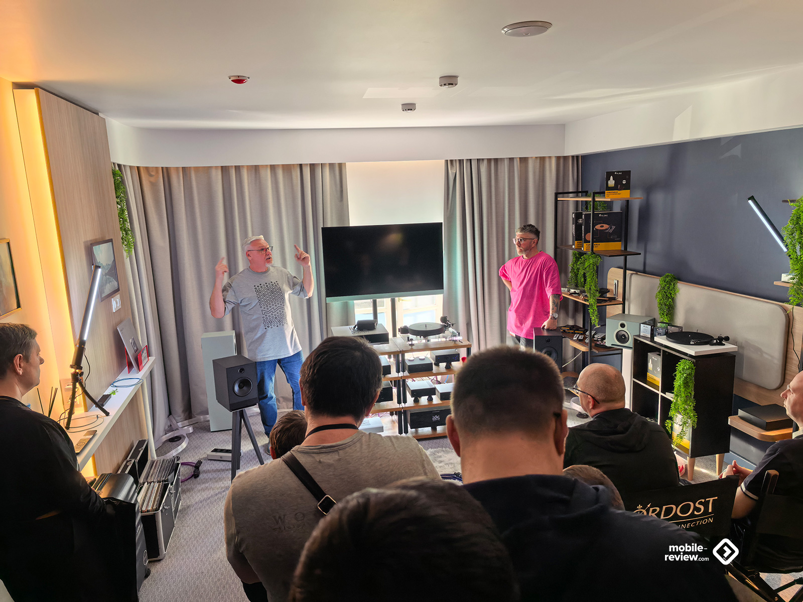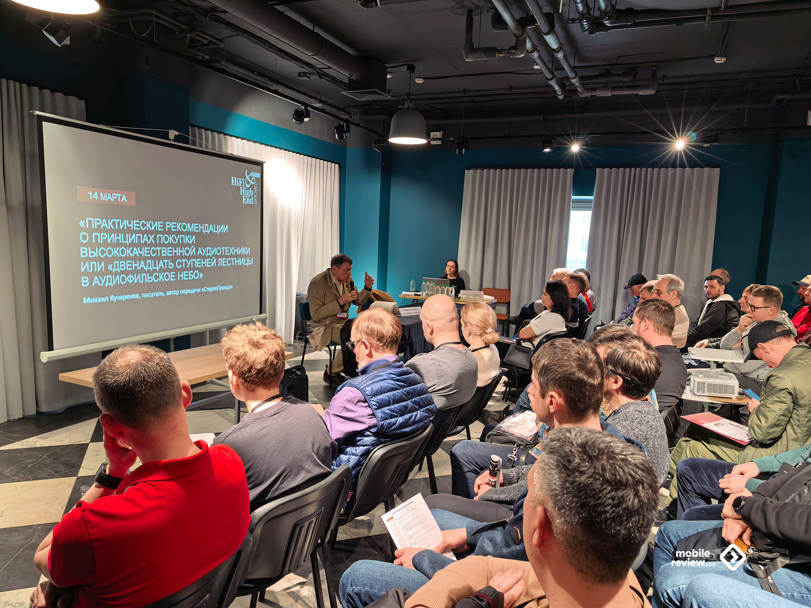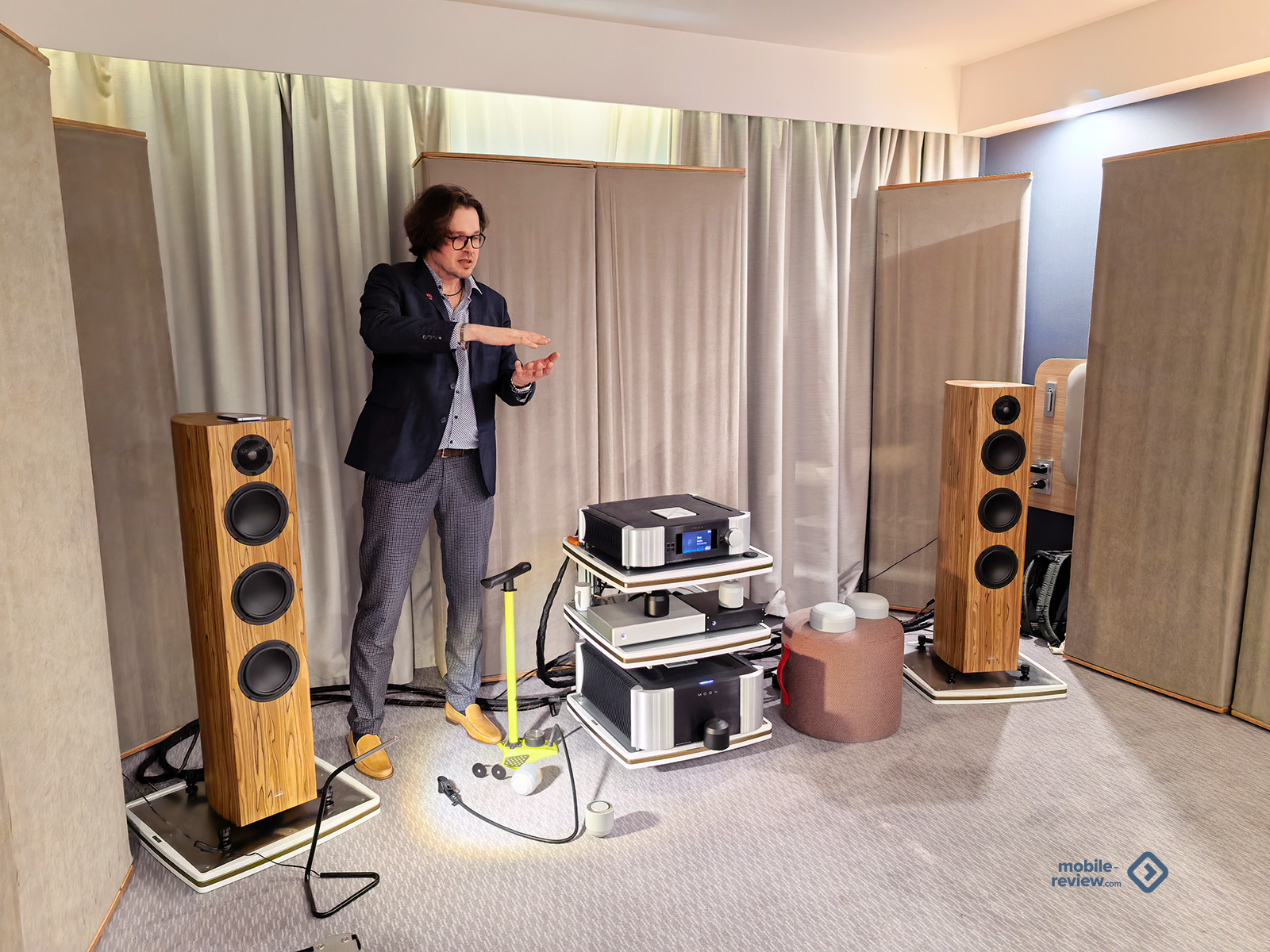 Ну и на сладкое — презентации и встречи. Они являются неотъемлемой частью выставки, и некоторые даже принципиально ходят только на них. Точнее, на конкретных лекторов — послушать, пообщаться, задать каверзные и не очень вопросы. Какие-то общие, глобальные моменты обсуждались в отдельном зале с проектором и микрофоном, особенности каких-то акустических систем или необычные решения — прямо в комнатах. На одном из кадров вы можете увидеть жёлтый велосипедный насос: на стенде рассказывали про новую (ага, которую уже много лет используют в науке и точном приборостроении) систему виброразвязки на базе пневмостола — по сути, платформы с надутой резиновой камерой между её «полом» и «потолком».