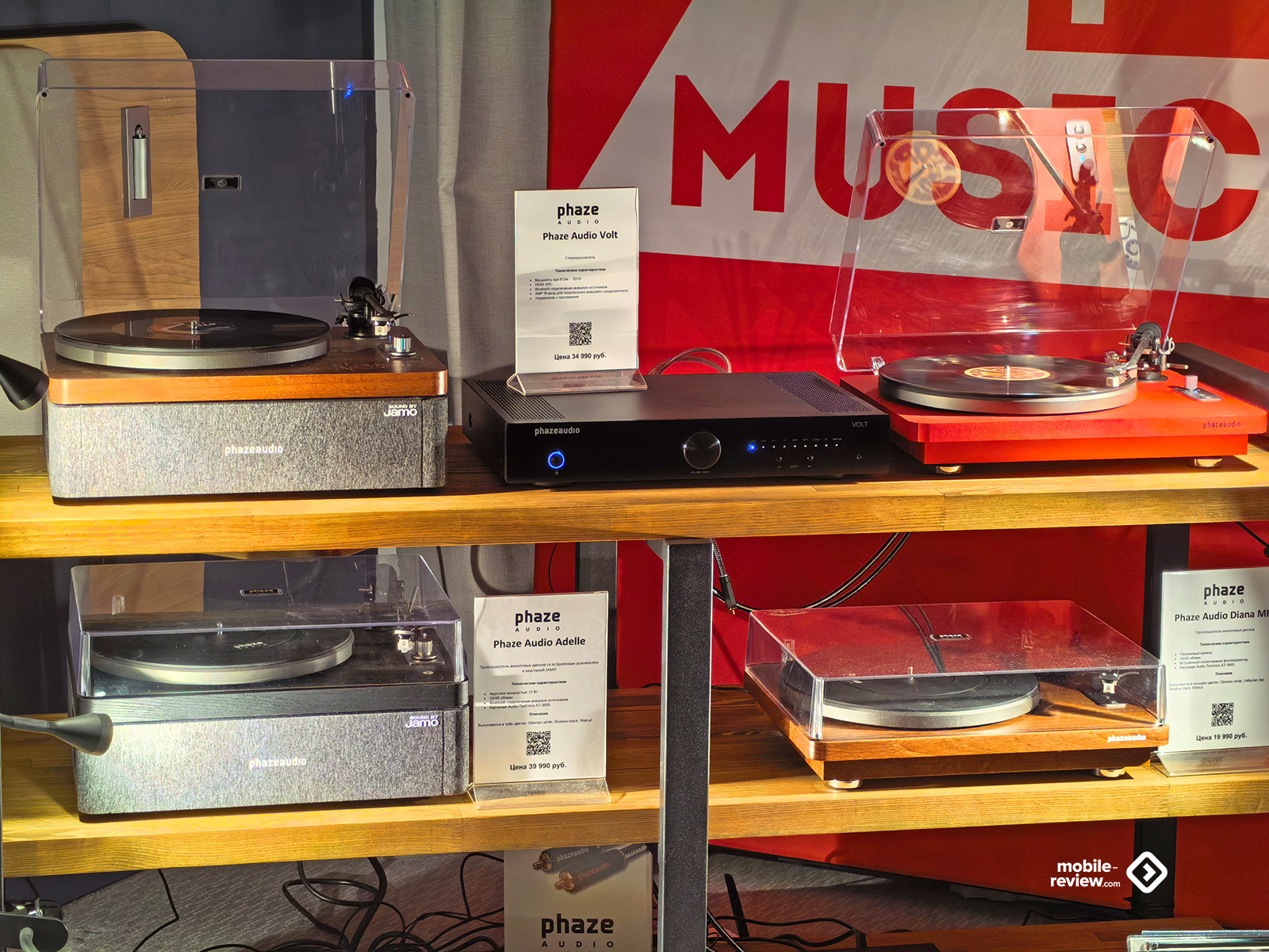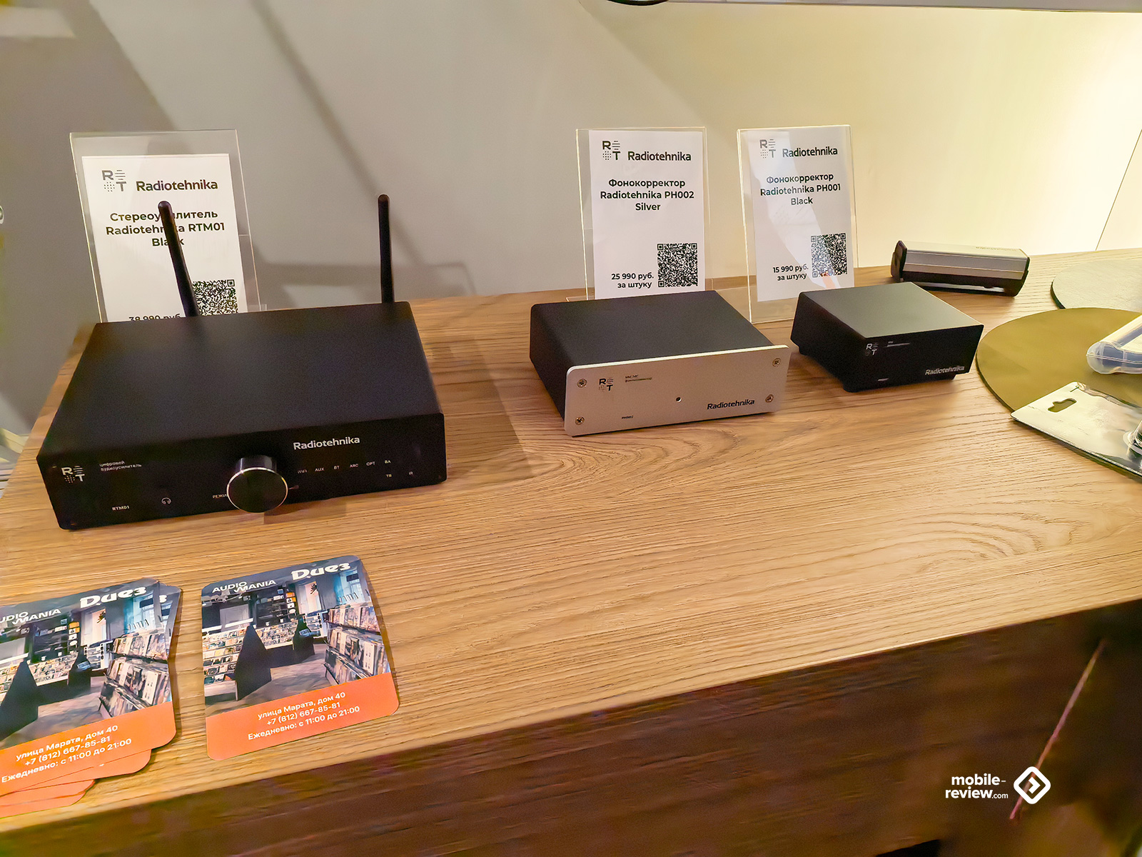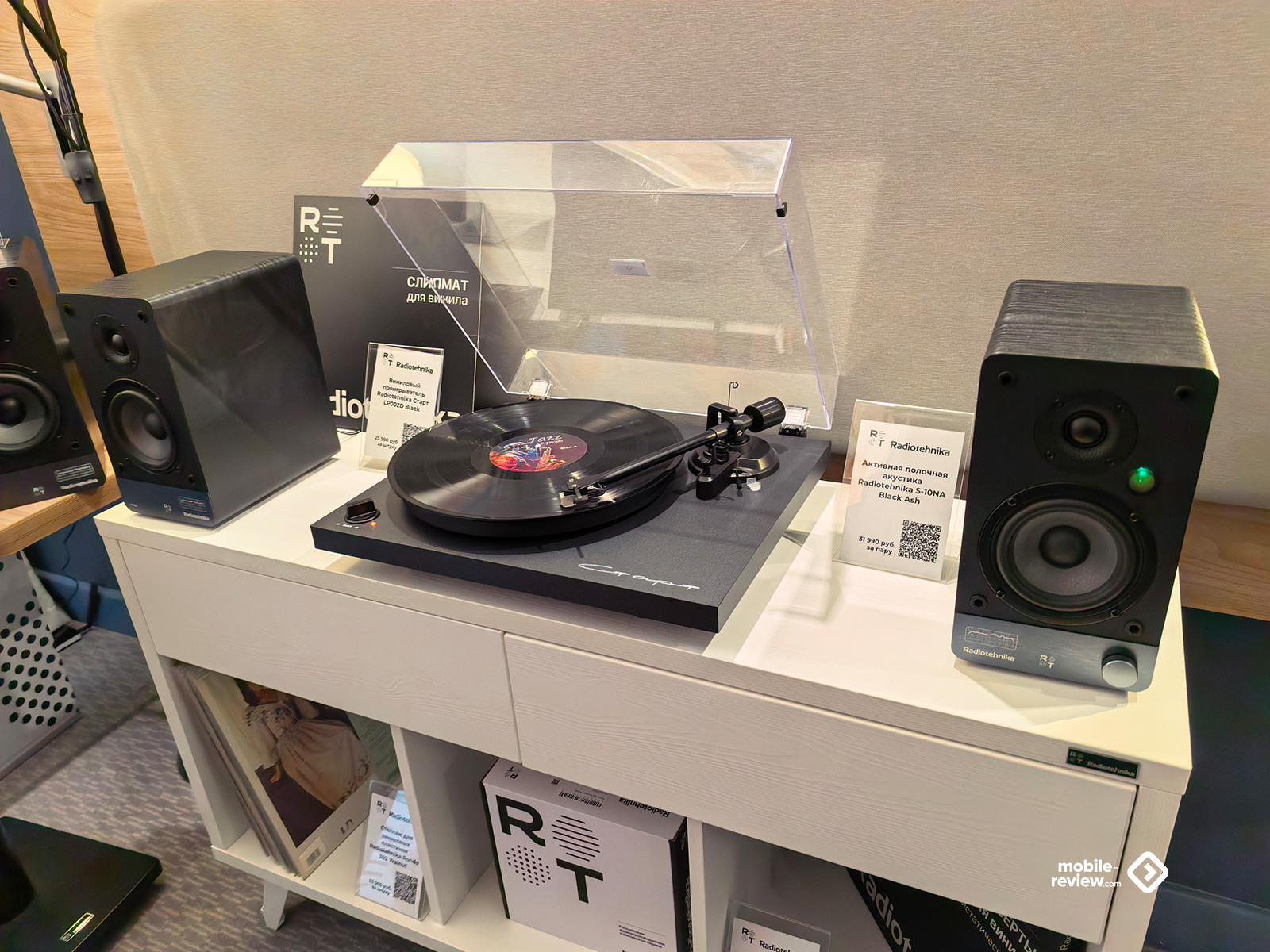 В плане винила тоже будто есть некоторая просадка: всё меньше проигрывателей выставлено — даже для антуража, да и на тех особо не акцентировали внимание, мол, есть такое, смотрите, но акустика всё равно важнее. Была пара Transrotor, крутившаяся просто ради процесса, несколько вертушек от Phaze Audio со встроенными динамиками, усилителями и Bluetooth да минималистичная по виду модель «Старт» от Radiotehnika с отдельными аксессуарами и фонокорректорами от них же. Плюс сами пластинки: как в виде «золотых изданий», стоящих в качестве оформления комнаты, так и обычные — разной степени новизны и стоимости в отдельном «загончике», называемом «Виниловый базар», рядом с кассетами, CD и футболками. На одном из стендов обнаружились даже дорогущие хромовые кассеты, в коробках с которыми лежали «подходящие для этой музыки» ароматизаторы, но это уже очень «узкая» история для истинных ценителей.