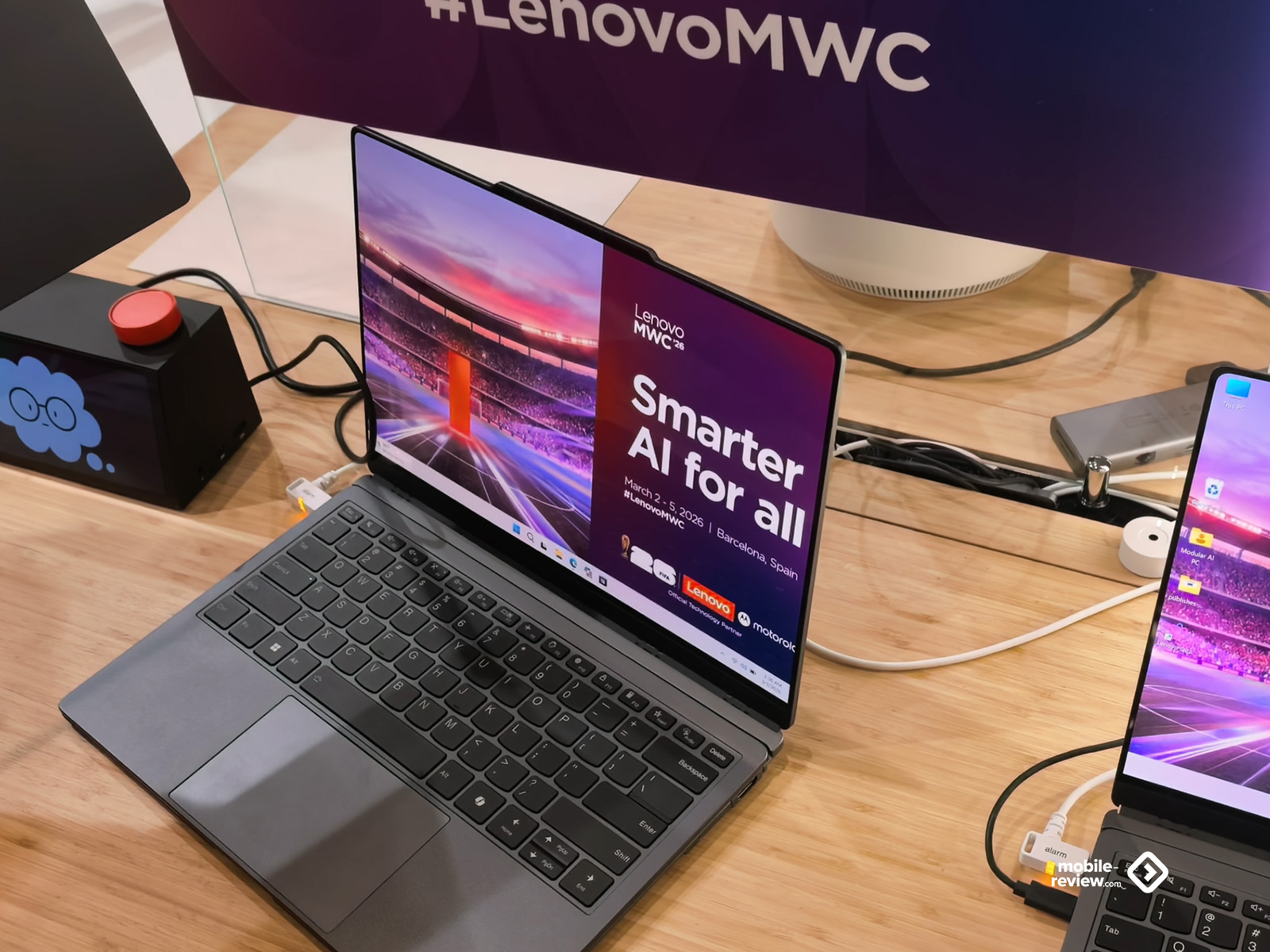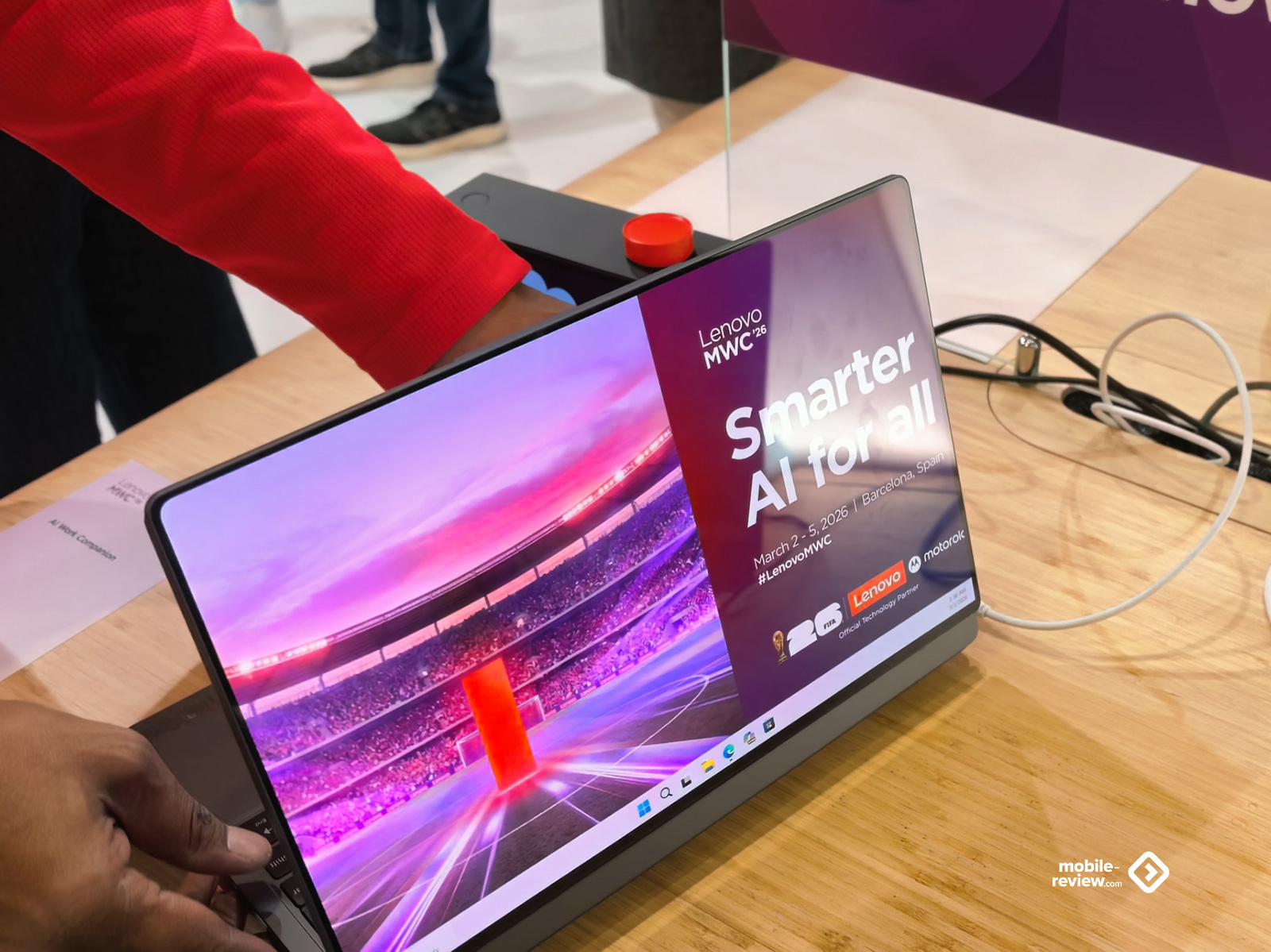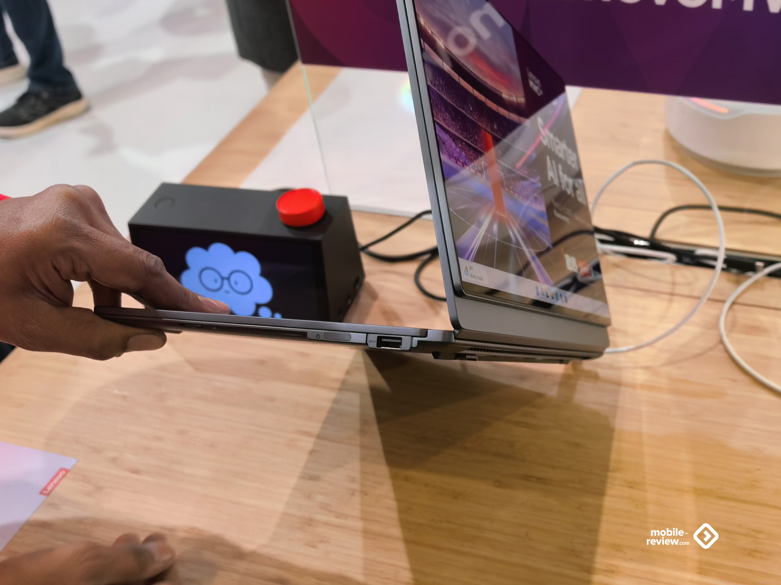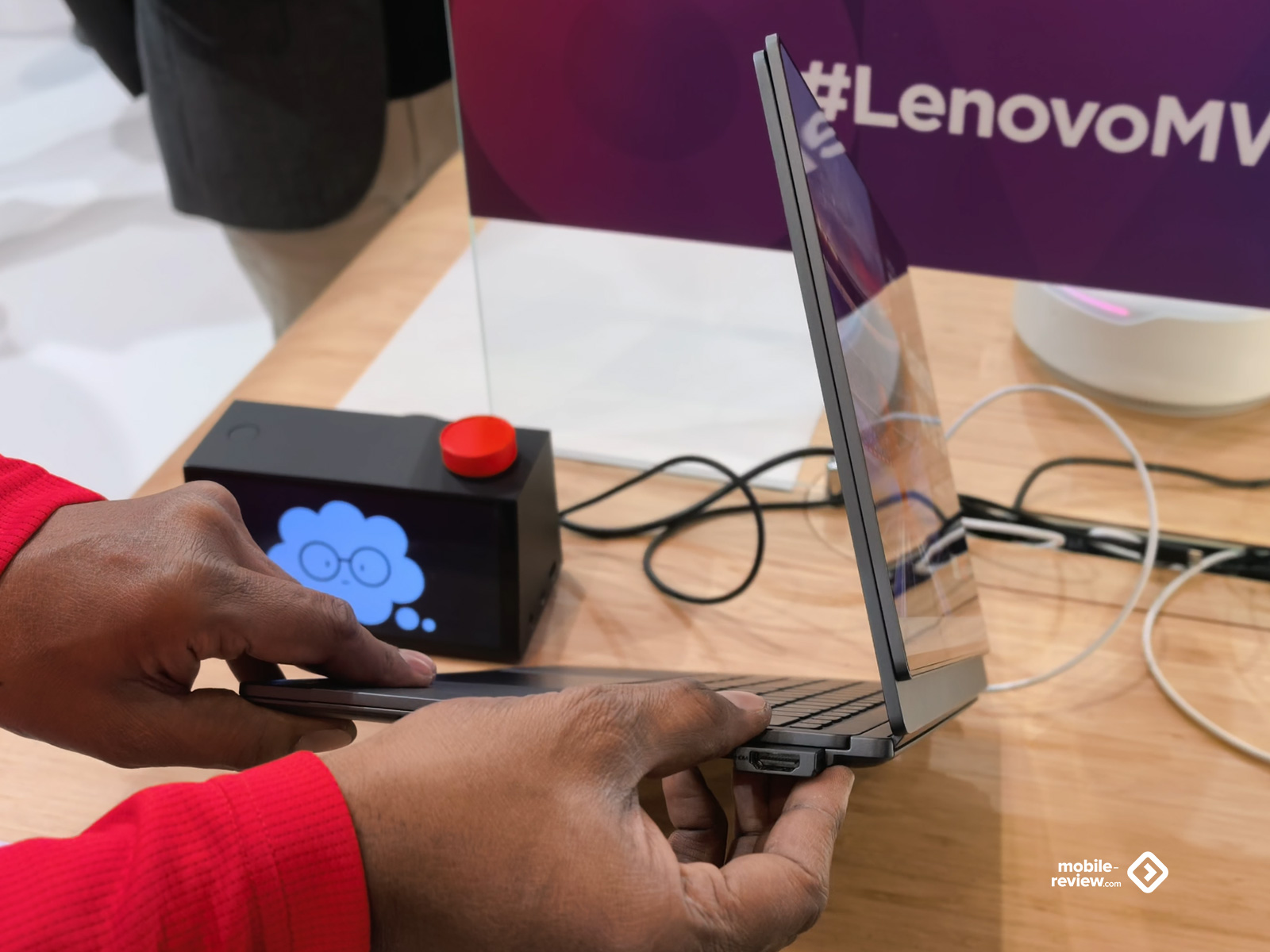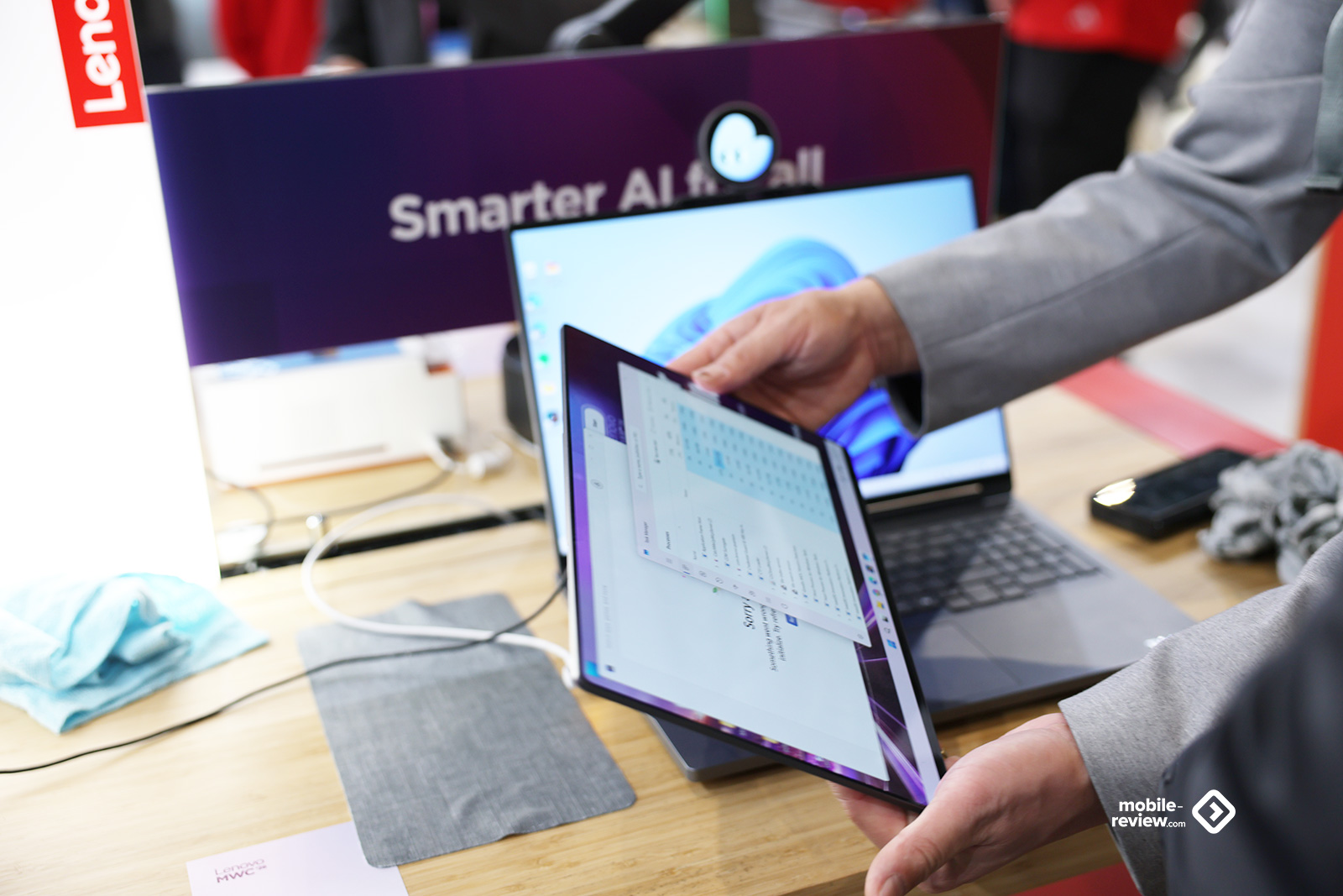 За стеклом показывают различные ноутбуки Lenovo, где экраны выезжают из корпуса, растягиваются в большие столбики. Выглядит красиво, интересно, но зачем это нужно на практике, совершенно непонятно.