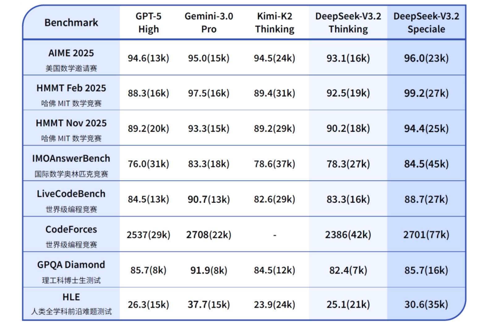 Модель DeepSeek-V3.2, по оценкам разработчика, в тестах производительности демонстрирует уровень, сравнимый с GPT-5 от OpenAI, и лишь незначительно уступает Gemini 3.0 Pro от Google, при этом существенно сокращая длину выходных данных, что снижает вычислительные затраты и время ожидания ответа. DeepSeek-V3.2-Speciale является улучшенной версией V3.2, включающей возможности глубокого мышления и выполнение доказательств математических теорем из DeepSeek-Math-V2. Бенчмарки AIME, HMMT, GPQA и ряд других показывают, что эта модель отличается улучшенными способностями в логическом выводе, математических доказательствах и следовании инструкциям, достигая производительности, сопоставимой с Gemini 3.0 Pro в тестах логического вывода. Модель V3.2-Speciale успешно завоевала золотые медали на олимпиадах по математике, программированию и информатике IMO 2025, CMO 2025, ICPC World Finals 2025 и IOI 2025.