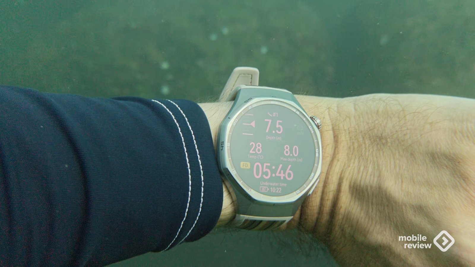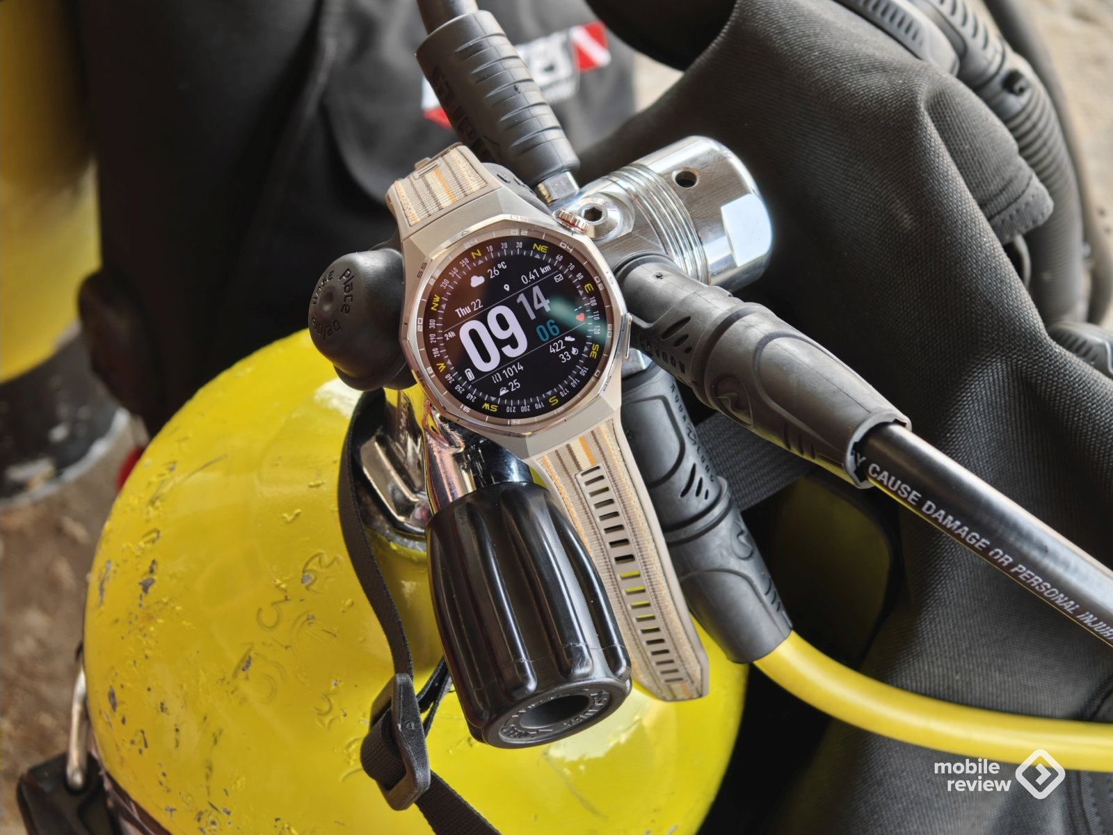 У часов есть сертификация IP69 и заявлена возможность погружаться на глубину до 40 метров. Так что мои ныряния на 20–24 метра часы выдержали легко. Режим дайвинга включается автоматически. Часы показывают глубину и температуру воды в реальном времени. А также скорость погружения и подъема. Еще есть компас. И он отлично работает. Во время экзамена я сумел, ориентируясь по нему, доплыть до заданной точки.