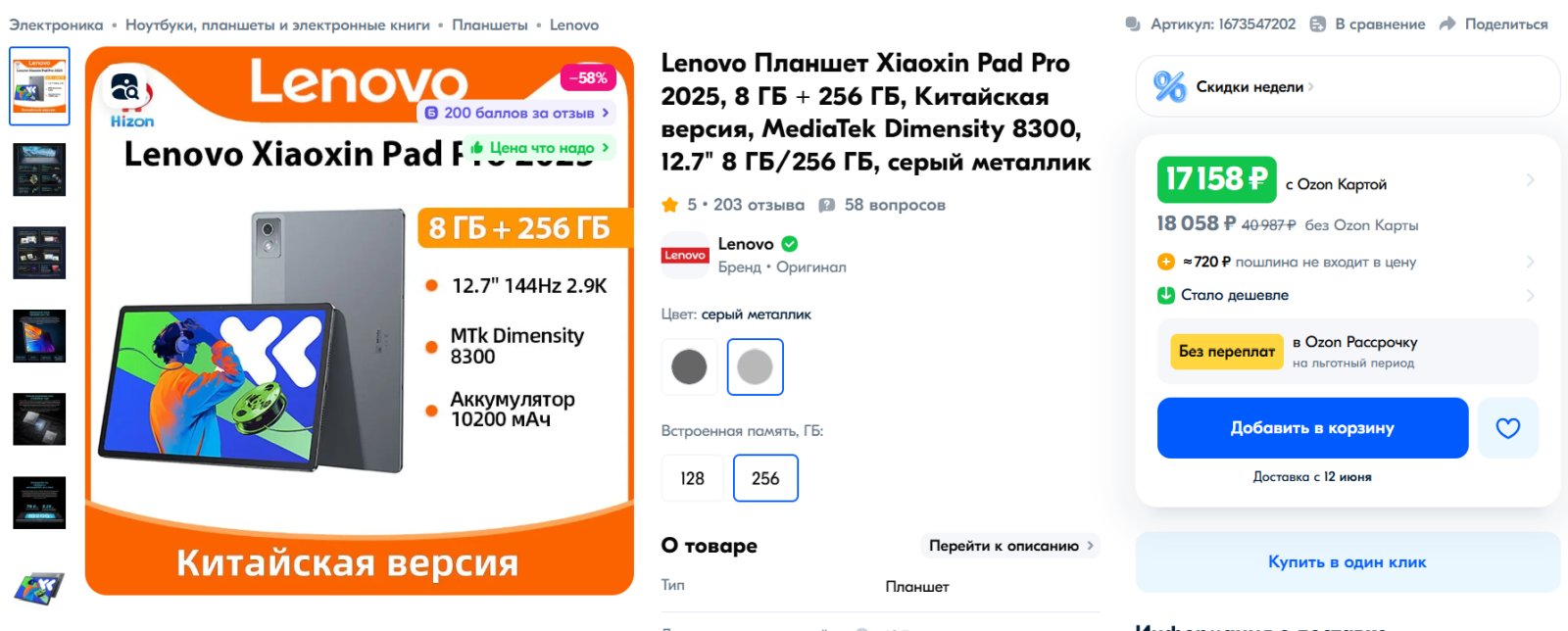 В случае с Lenovo Xiaoxin Pad Pro 12.7 надо ещё смотреть, где покупаете. Например, в DNS эту модель продают за 23 тысячи рублей. Но это русифицированный (видимо, силами сотрудников DNS) китаец. Так что, если соберетесь покупать, во-первых, рекомендую посмотреть версии планшета на маркетплейсах. Например, на Ozon сейчас продается модель на чипсете Dimensity 8300 (1.5 млн баллов в тесте AnTuTu v10) за 17 200 рублей. Во-вторых, приготовьтесь к тому, что придется заняться русификацией (даже если в DNS купите). Для этого придется потратить пару часов, чтобы изучить все информацию на форумах типа 4pda. В целом, сложного ничего нет, а счастливые обладатели планшета рассказывают, что все отлично работает и даже обновления по воздуху прилетают.